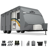 Q: Is the Travel Trailer RV Cover waterproof?A: Yes, the RV cover is made from a heavy-duty, waterproof non-woven fabric that protects your vehicle from rain, snow, and other moisture, ensuring it stays dry and secure.