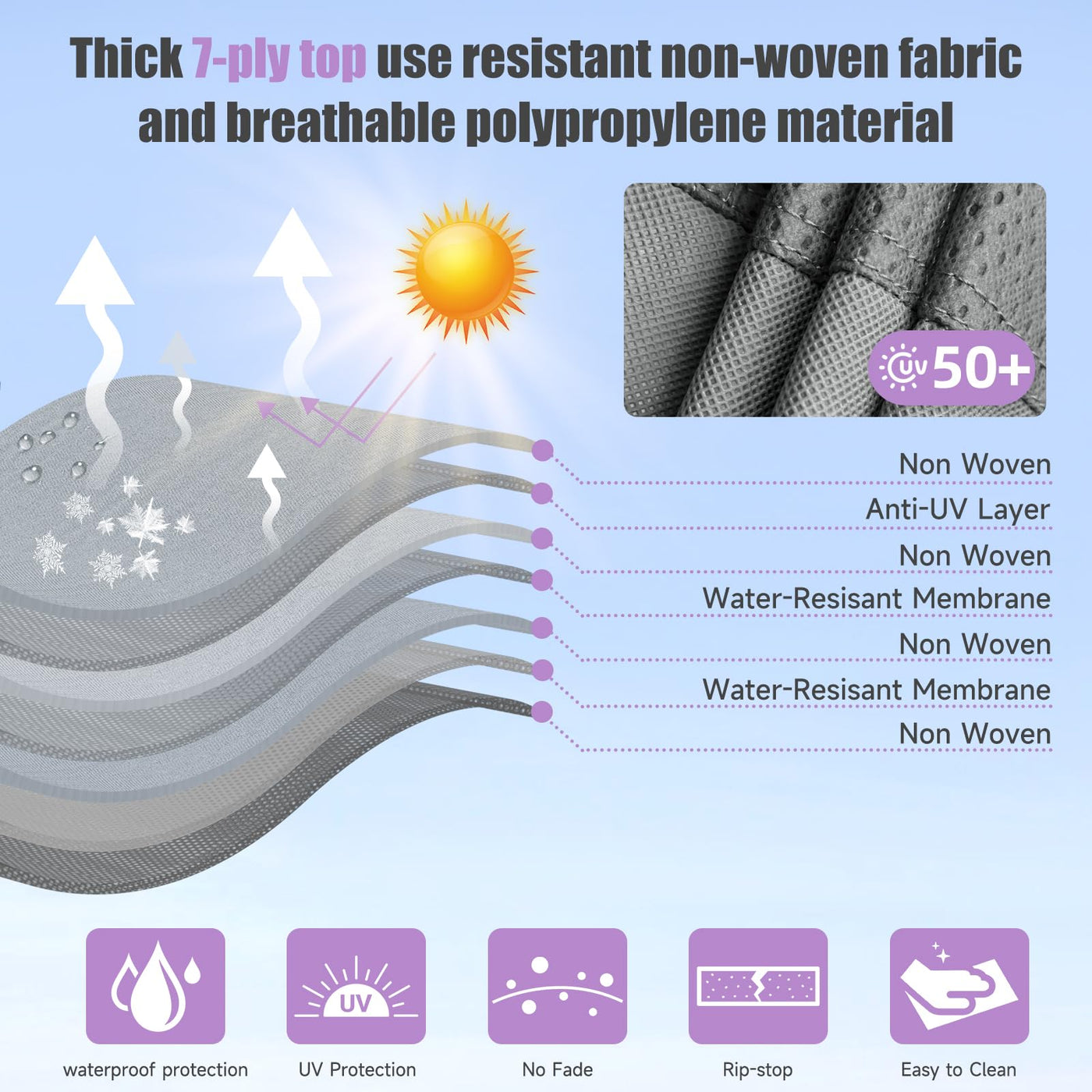 Q: What materials are used in the construction of the DikaSun RV Cover?A: The cover is made from a thick, resistant non-woven fabric combined with breathable polypropylene material, which prevents bird waste, dust, and scratches while allowing air circulation to reduce moisture build-up.
