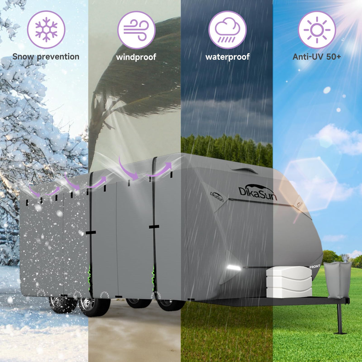 Q: How does the DikaSun RV Cover protect against winter weather?A: This RV cover features a heavy-duty 7-ply construction that is windproof, waterproof, and snowproof, providing optimal protection against harsh winter conditions and preventing damage from snow accumulation.