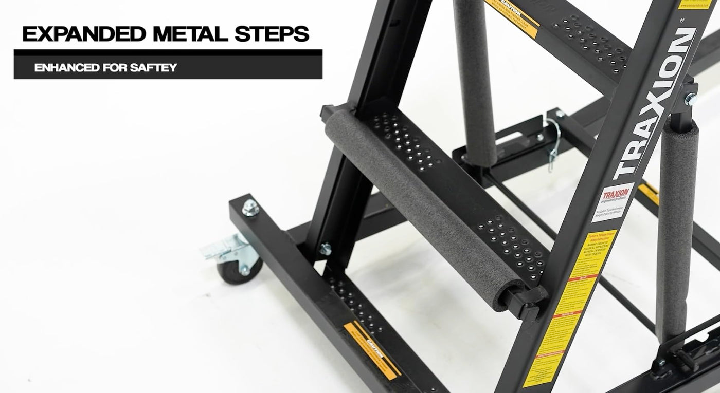Q: How does the folding mechanism work on the Traxion Topside Creeper?A: The Topside Creeper easily folds away into a compact configuration, allowing for convenient storage when not in use, which is ideal for garages with limited space.