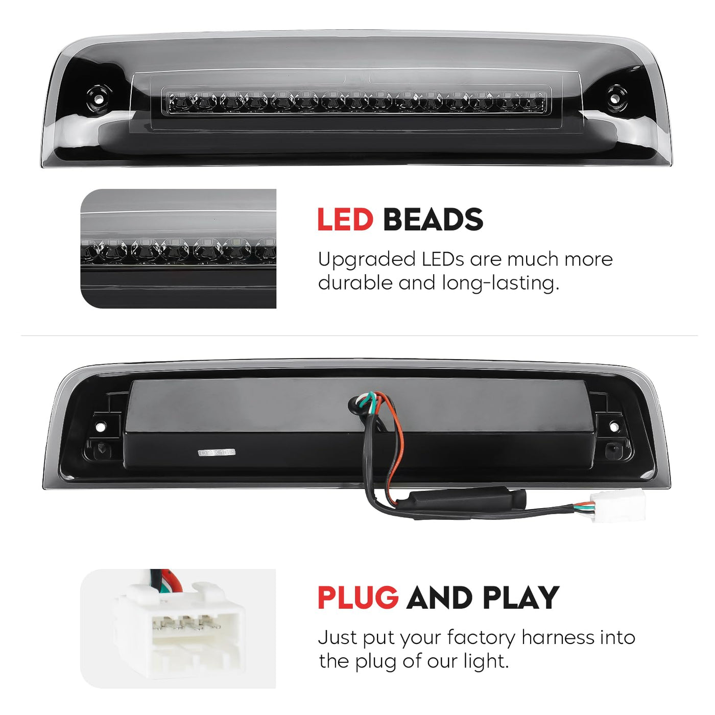 Tresound is a professional LED light manufacturer that offers a wide range of high-quality LED lighting solutions. Tresound LED lights are designed to be aesthetically pleasing. Tresound LED lights are designed to be durable and reliable. Tresound LED lights are designed to be easy to install and maintain. ALL-IN-ONE BRAKE LIGHT: Brake light + Cargo light function Note: Does not fit for 2009-2010 factory brake light W/O connecter Compatible with: for 2009-2017 Dodge Ram 1500 for 2010-2017 Dodge Ram 2500 for 2010-2017 Dodge Ram 3500 Specification: Plug and go; Waterproof gasket included; DOT Certification 3rd Brake Light Color: Chrome Housing Smoked Lens Package Included: 1* 3rd Brake Light 1* Waterproof Gasket Tips: After removing your old brake light, please use some alcohol to clean the gasket area and lip on the light. Then attach to the light.