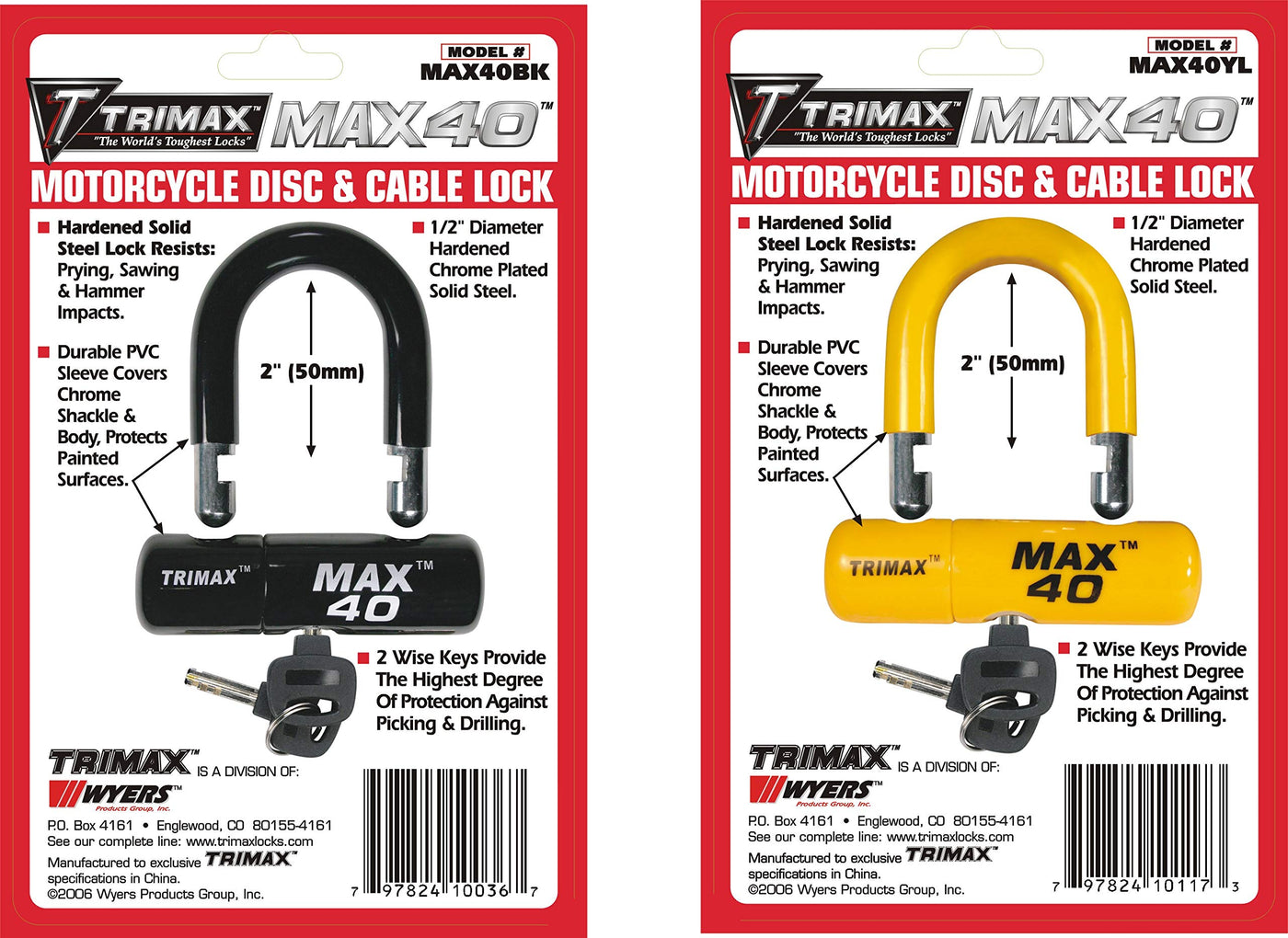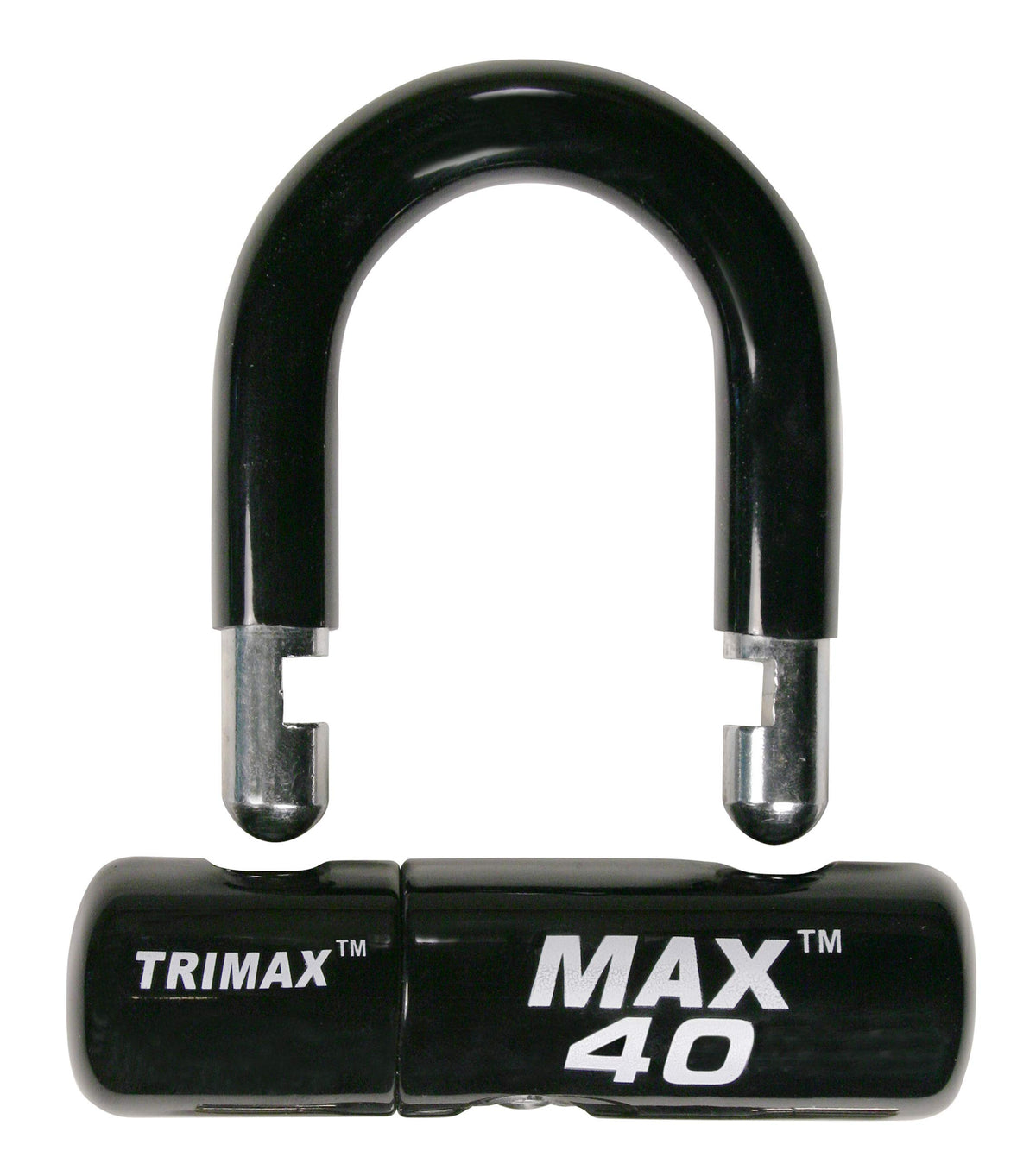 Trimax Max40Bk The Max40Bk Is A Short Shackle Motorcycle Disc Cable U-Lock With Black Sleeve Over Chrome Shackle. Trimax Cable U-Locks Are Simply The Strongest Short Shackle Locks You Can Buy. The Max60 Is Ideal When Combined With A Trimax Cable Or Chain For Securing Motorcycles, Bicycles, Spare Tires, Atvs, Marine, Trailers And Much, Much More. Tough Polymer Outer Skin Absorbs Hammer Strikes And Reduces Marring And Scratching. Trimax Makes The World'S Toughest Locks. Through Value Added Engineering Design, Trimax Is Committed To Product Innovation That Holds Up To The Highest Quality Standards. Trimax Provides Maximum Security For Marine, Trailer And Tow, Rv, Performance Truck, Power Sports And Bicycle Applications. Tested. Tough. Trimax..