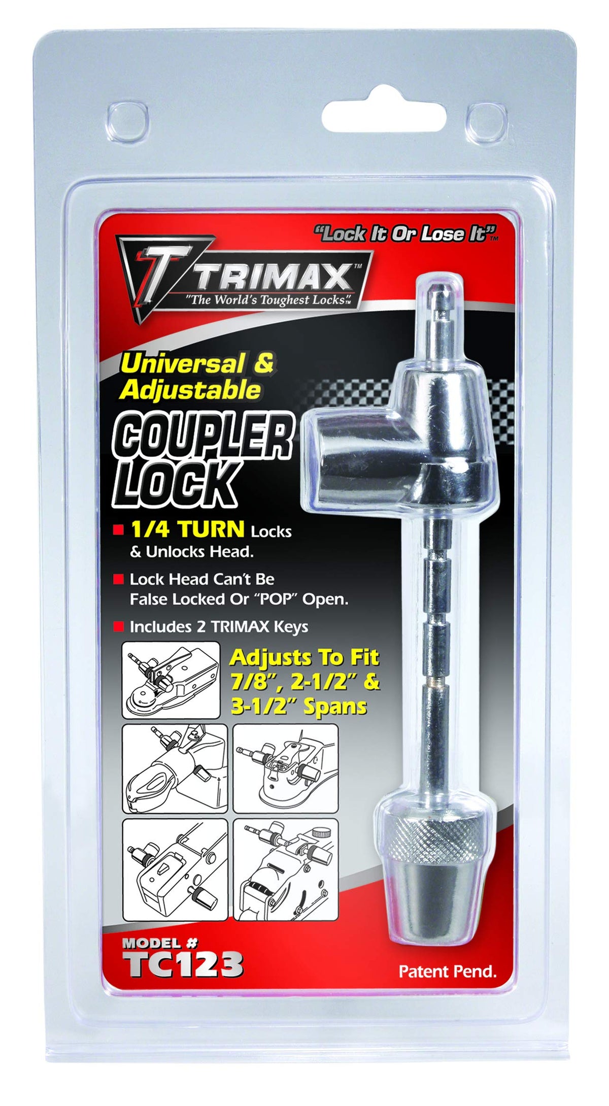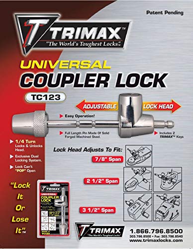 Q: What types of couplers is the TRIMAX TC123 Universal Coupler Lock compatible with?A: The TRIMAX TC123 Universal Coupler Lock is designed to fit adjustable couplers ranging from 1/2 inch to 3-1/2 inch spans, making it suitable for a wide variety of towing applications.