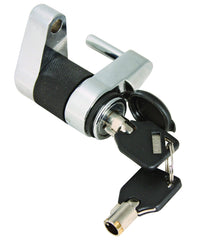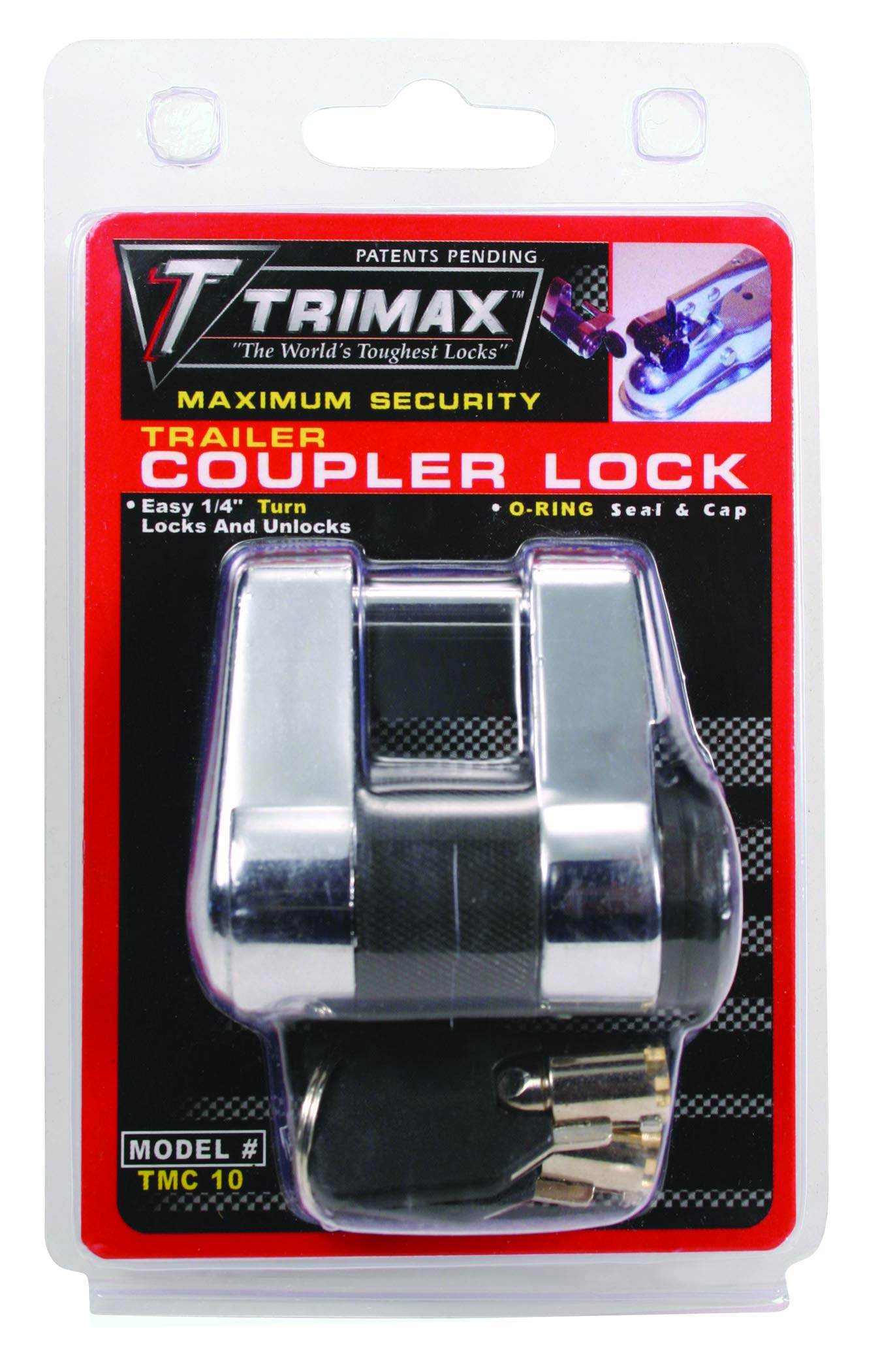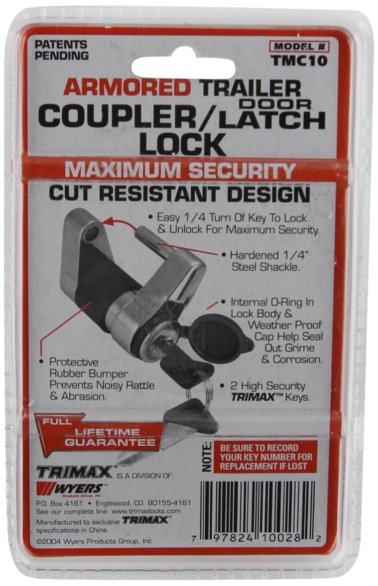 Trimax TMC10 The TMC10 features a Zinc alloy and a protective rubber bumper that prevents noisy rattling and abrasion to ensure your finish is not marked. Provides additional security for your camper, boat or trailer by securing the coupler on your trailer tongue. Also secures trailer door latches, cargo boxes and other types of doors. Features patented 1/4 turn technology that cannot be false locked. Provides dual force protection when used with the UMAX100 (sold separately). Features teeth inside the lock so the lock will not fall apart if cut. A coupler is the forward most part of a trailer tongue that envelopes and secures to the tow vehicle hitch ball. The lever on the coupler both allows the ball to be received into the coupler and prevents the ball from being removed. Accordingly, a coupler lever lock prevents the lever from moving into the open position. For maximum security when a trailer, boat or RV is hooked up to a vehicle, a coupler lever lock should be combined with an unattended trailer lock such as the UMAX100 or UMAX50. TRIMAX makes the world's toughest locks. Through value added engineering design, TRIMAX is committed to product innovation that holds up to the highest quality standards. TRIMAX provides maximum security for marine, trailer and tow, RV, performance truck, power sports and bicycle applications. Tested. Tough. TRIMAX..