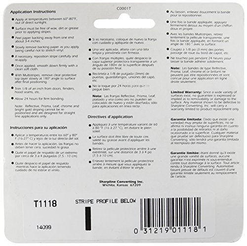 Q: What is the width and length of the TRIMBRITE T1118 pinstripe tape?A: The TRIMBRITE T1118 pinstripe tape has a width of 1/8 inch and a length of 36 feet, making it ideal for various applications on vehicles.