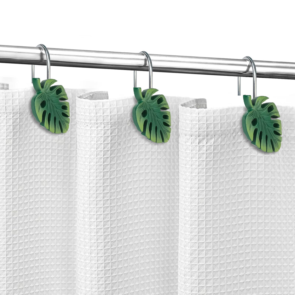 Tropical Leaf Decorative Shower Curtain Hooks Green Botanical Shower Curtain Rings, Resin, Monstera Deliciosa Leaves Shower Curtain Hangers For Bathroom, Set Of 12