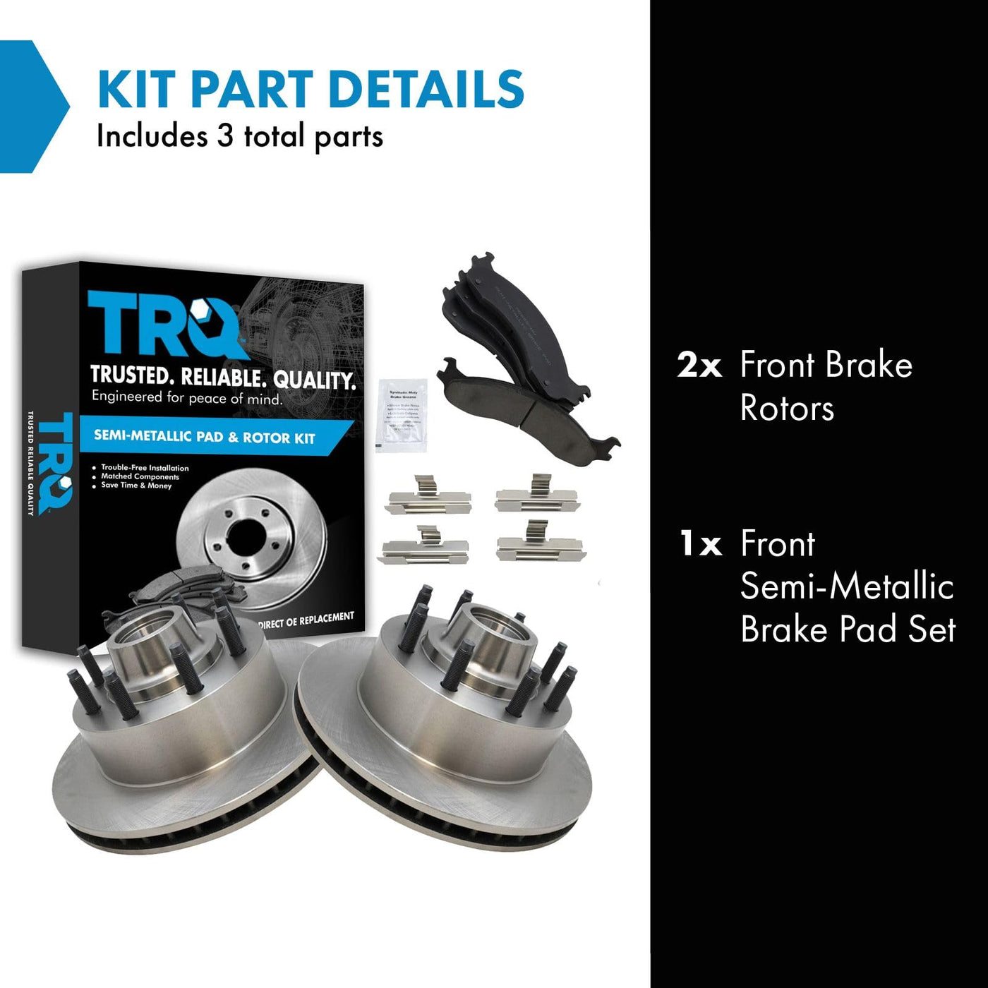 Semi-Metallic Brake Pad & Rotor KitKit Includes(1) Front Semi-Metallic Brake Pad Set(2) Front Brake RotorsFitmentCompatible with: 2003-07 Ford E250 FrontCompatible with: 1995-98 Ford E350 Econoline Front with 4 Wheel ABS Brakes with Single Rear Wheels SRWCompatible with: 2000-02 Ford E250 Econoline FrontCompatible with: 1995-99 Ford E250 Econoline Front with 4 Wheel ABS BrakesCompatible with: 2003-05 Ford E350 Club Wagon Front with Single Rear Wheels SRWCompatible with: 1995-98 Ford E350 Econoline Club Wagon Front with 4 Wheel ABS Brakes with Single Rear Wheels SRWCompatible with: 2000-07 Ford E350 Super Duty Front with Single Rear Wheels SRWCompatible with: 2000-02 Ford E350 Econoline Club Wagon Front with Single Rear Wheels SRWCompatible with: 1997 Ford F250 Truck Super Duty Rear Wheel Drive Front with 2 Wheel ABS Brakes with 8 Lug WheelsProduct AttributesBrake Pad Bonding Type: Premium PosiBrake Pad Friction Material: Semi-MetallicProduct Features Positive Molded - Less dust resulting in clean wheels G3000 Casting Alloy - Reduced noise and improved wear resistance Application Specific Design - Extended service life, no modificationsItem DetailsTRQ brake kits are designed to restore your brake system to like-new performance. TRQ brake pads are positive molded, thermal scorched, chamfered, and utilize a multi-layer shim for enhanced performance and service life. TRQ rotors have a non-directional finish that reduces the break-in period for new rotors as well as reducing vibrations throughout the rotors lifecycle. All products are fit and road-tested in our Massachusetts R&D facility to ensure we deliver on our promise of Trusted Reliable Quality.Reference NumbersAimco: 54031Bendix: PRT5057Dodge: 05003921AADuraGo: BR54031Ford: 1C2Z2001AA, 1C2Z2001BA, 4C2Z2001BB, 4C2Z2001CA, F5TZ2001A, F7UZ2001AARaybestos Brakes: 66528, 66528FZN, 66528P, 66528R, PGD655M, SP655PSH, SP655SBH, SP655TRHWagner: BD125477