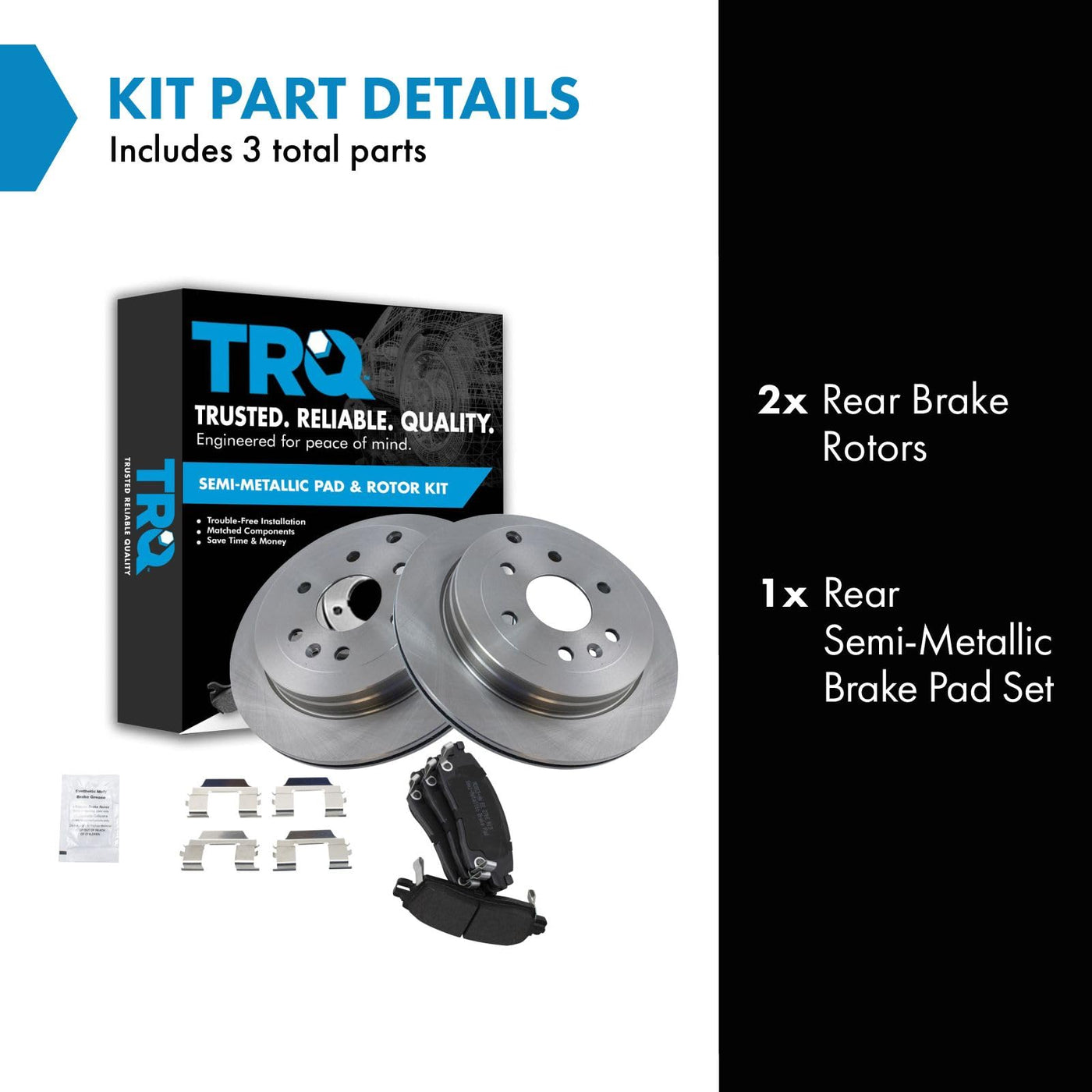Semi-Metallic Brake Pad & Rotor KitKit Includes(1) Rear Semi-Metallic Brake Pad Set(2) Rear Brake RotorsFitmentCompatible with: 2009-17 Chevrolet Traverse RearCompatible with: 2007-16 GMC Acadia RearCompatible with: 2008-17 Buick Enclave RearCompatible with: 2007-10 Saturn Outlook RearCompatible with: 2017 GMC Acadia Limited RearProduct AttributesRear Brake Rotor Diameter: 13.03 in. (331mm)Wheel Lug Count: 6 LugBrake Pad Bonding Type: Premium PosiBrake Pad Friction Material: Semi-MetallicRear Brake Rotor Venting Type: VentedProduct Features Positive Molded - Less dust resulting in clean wheels G3000 Casting Alloy - Reduced noise and improved wear resistance Application Specific Design - Extended service life, no modificationsItem DetailsTRQ brake kits are designed to restore your brake system to like-new performance. TRQ brake pads are positive molded, thermal scorched, chamfered, and utilize a multi-layer shim for enhanced performance and service life. TRQ rotors have a non-directional finish that reduces the break-in period for new rotors as well as reducing vibrations throughout the rotors lifecycle. All products are fit and road-tested in our Massachusetts R&D facility to ensure we deliver on our promise of Trusted Reliable Quality.Reference NumbersAimco: 55151Bendix: PRT5749Buick: 15855898, 19149111, 22866196, 88983915, 88983916Cadillac: 22892950Chevrolet: 15855898, 19149111, 22866196, 88935752, 88935809, 88983915, 88983916DuraGo: BR900378GMC: 15855898, 19149111, 22866196, 88935752, 88935809, 88983915, 88983916Hollander: 533-00117Isuzu: 8191491110, 8889839150Oldsmobile: 88935752, 88983916Raybestos Brakes: 580569, 580569FZN, 580569P, 580569PER, 580569R, EHT883HSaab: 19149111, 88983915, 89027184Saturn: 15855898Wagner: BD126503