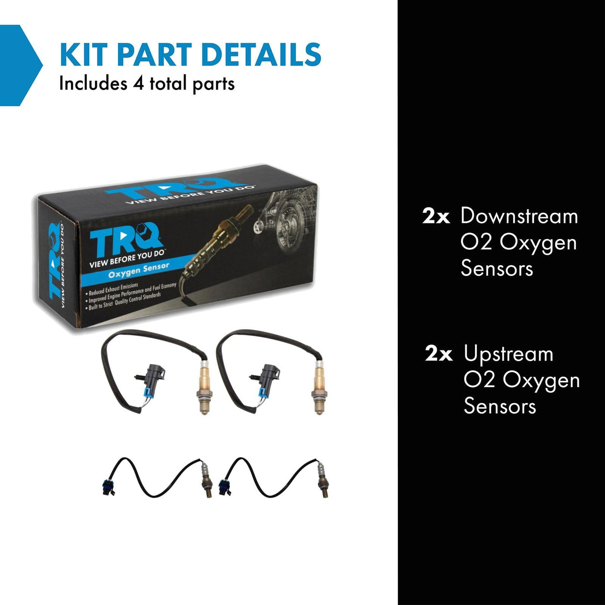4 Piece O2 Oxygen Sensor SetKit Includes(2) Downstream O2 Oxygen Sensors(2) Upstream O2 Oxygen SensorsFitmentCompatible with: 2008-13 Chevrolet Silverado 1500 V6 4.3L Upstream & DownstreamCompatible with: 2008-13 GMC Sierra 1500 V6 4.3L Upstream & DownstreamCompatible with: 2008 Hummer H2 V8 6.2L Upstream & DownstreamProduct AttributesQuantity: 4 PieceProduct Features Application Specific Design: No modifications and pre-calibrated Isotatic-pressed and plasma-sprayed for extended service life Double-Layered 310S Stainless Steel: Additional protection from moisture and debris Restored Engine Performance: Improved fuel economy and lower emissionsItem DetailsTRQ oxygen sensors are manufactured to precise specifications using premium raw materials to optimize your vehicles emission system. Each sensor is isostatically-pressed for improved strength and durability, and plasma-sprayed to improve sensitivity and prolong the service life of the sensors. Oxygen sensors wear out over time and should be replaced every 60,000 miles to prevent poor engine performance. TRQ recommends replacing the oxygen sensors in sets to optimize fuel economy and reduce overall emissions. All products are fit and road-tested in our Massachusetts R&D facility to ensure we deliver on our promise of Trusted Reliable Quality.Reference NumbersACDelco: 12580466, 12585999, 12589321, 12597989, 12604913, 12606671, 12609456, 12612506, 12615124, 213-3536, 213-3544, 213-3545, 213-3866, 213-3913, 213-4350, 213-4351, 213-4537, 25180901, 25182983Bosch: 15128, 15150Delphi: ES20000, ES20352DENSO: 234-4236, 234-4242, 234-4246, 234-4249, 234-4258, 234-4337, 234-4339, 234-4348, 234-4773, 234-4774, DOX0301Isuzu: 8125859990, 8125907490, 8126049130Niehoff: FE80806, FE80813, FE80817, FE80826, FE80838Omnicraft: QDY70OMNIPARTS: 19060388, 19060413Standard Motor Products: SG1621, SG1628, SG1632, SG1641, SG1653, SG1827Walker Products: 250-24703, 250-24704