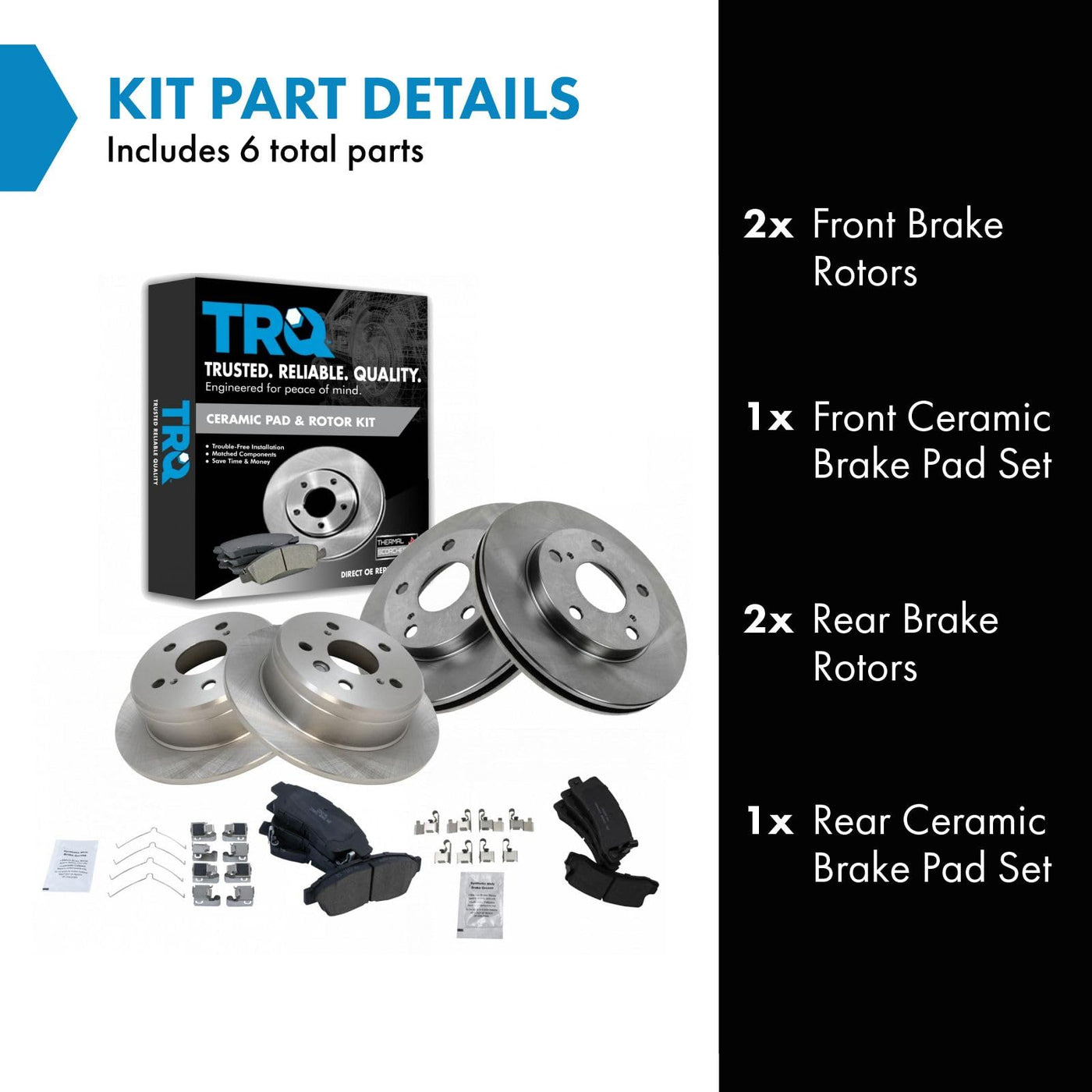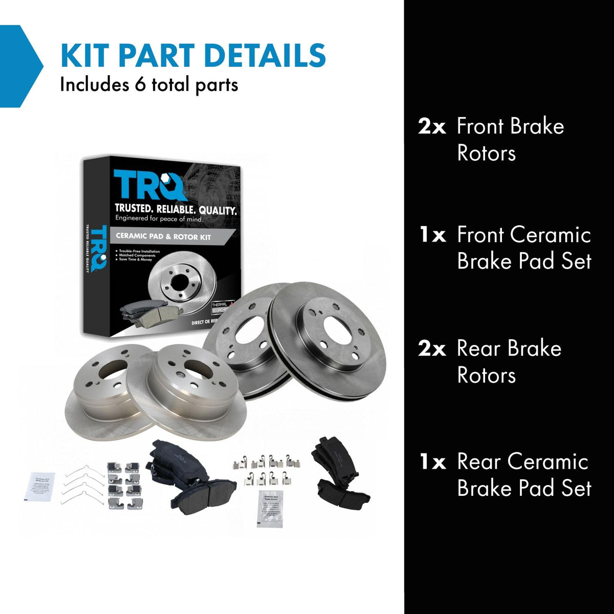 Ceramic Brake Pad & Rotor KitKit Includes(1) Front Ceramic Brake Pad Set(1) Rear Ceramic Brake Pad Set(2) Front Brake Rotors(2) Rear Brake RotorsFitmentCompatible with: 1992-99 Toyota Camry Sedan L4 2.2L Front & RearCompatible with: 1994-96 Toyota Camry Coupe L4 2.2L Front & RearProduct AttributesFront Brake Rotor Diameter: 10.04 in. (255mm)Rear Brake Rotor Diameter: 10.60 in. (269mm)Wheel Lug Count: 5 LugBrake Pad Friction Material: CeramicBrake Pad Bonding Type: Premium PosiRear Brake Rotor Venting Type: SolidFront Brake Rotor Venting Type: VentedProduct Features Positive Molded - Less dust resulting in clean wheels G3000 Casting Alloy - Reduced noise and improved wear resistance Application Specific Design - Extended service life, no modificationsItem DetailsTRQ brake kits are designed to restore your brake system to like-new performance. TRQ brake pads are positive molded, thermal scorched, chamfered, and utilize a multi-layer shim for enhanced performance and service life. TRQ rotors have a non-directional finish that reduces the break-in period for new rotors as well as reducing vibrations throughout the rotors lifecycle. All products are fit and road-tested in our Massachusetts R&D facility to ensure we deliver on our promise of Trusted Reliable Quality.Reference NumbersAimco: 31075, 3291Bendix: PRT1724, PRT1726DuraGo: BR31075, BR3291Geo: 94855746Hollander: 533-58283, 533-58675Lexus: 446632010, 446633040, 446633050, 446633110, 449133010, 449232010, 449232070, 449233010Raybestos Brakes: 96216, 96216FZN, 96216P, 96216R, 96219, 96219FZN, 96219P, 96219R, EHT325H, EHT562H, MGD325CH, MGD562CH, SGD325C, SGD562, SGD562CToyota: 044912B050, 446512110, 446520140, 446533020, 446533090, 446533210, 446542041, 446620080, 446632010, 446632050, 446633010, 446633040, 449102030, 449133010, 449133011, 449220011, 449220050, 449220051, 449220060, 449220061, 449232040, 449232041, 449233010Wagner: BD125217, BD125222, BD126568