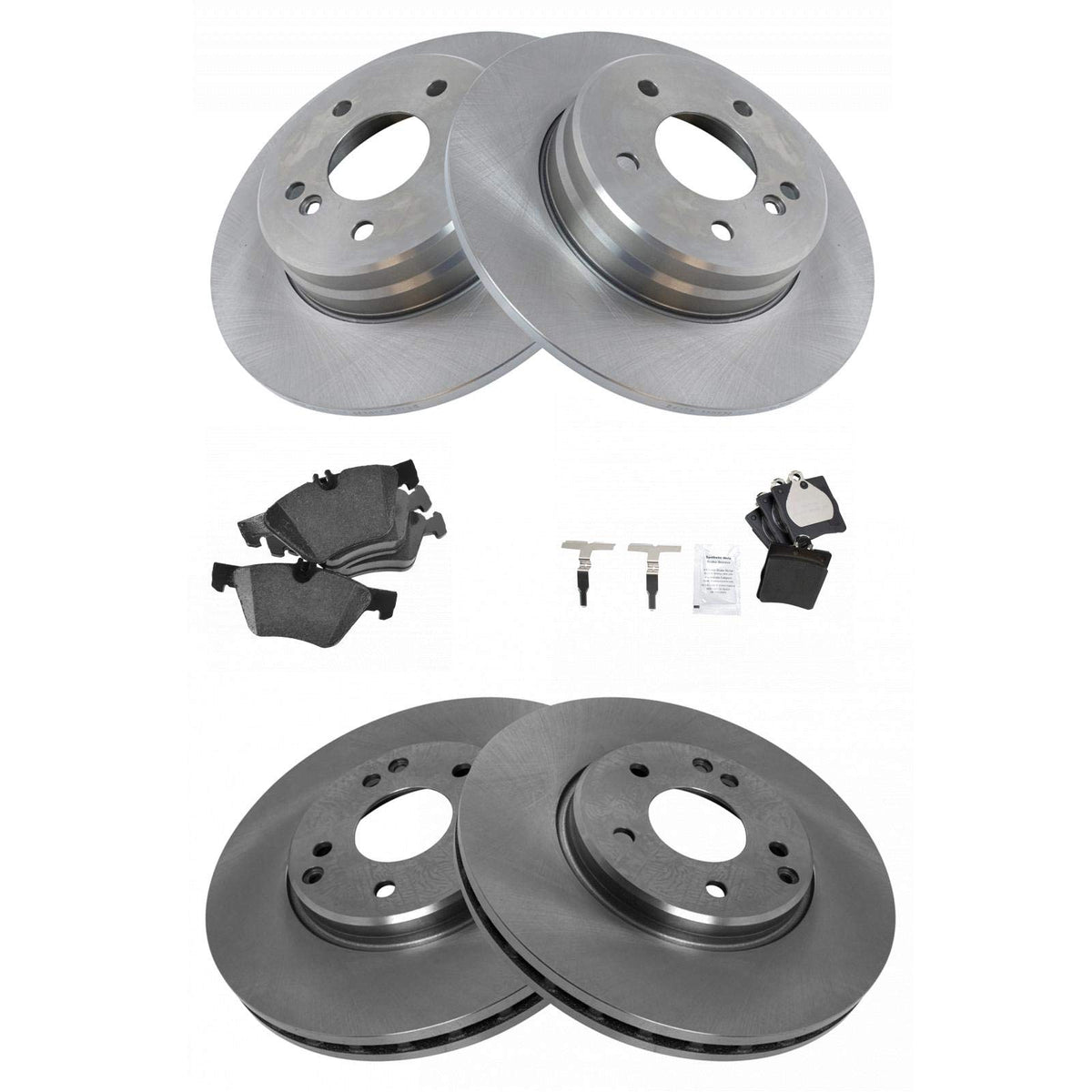 Ceramic Brake Pad & Rotor KitKit Includes(1) Front Ceramic Brake Pad Set(1) Rear Ceramic Brake Pad Set(2) Front Brake Rotors(2) Rear Brake RotorsFitmentCompatible with: 2000-02 Mercedes Benz E320 Sedan Front & Rear with 1 Rear Brake Pad Retaining PinCompatible with: 1998-99 Mercedes Benz E320 4Matic V6 3.2L Front & Rear with 1 Rear Brake Pad Retaining PinCompatible with: 2000-03 Mercedes Benz CLK430 Front & RearCompatible with: 2000-02 Mercedes Benz CLK320 Front & RearCompatible with: 2000-02 Mercedes Benz E430 Rear Wheel Drive Front & RearCompatible with: 1996-97 Mercedes Benz E320 Front & Rear with 1 Rear Brake Pad Retaining PinCompatible with: 2003 Mercedes Benz CLK320 Convertible Front & RearCompatible with: 1998-99 Mercedes Benz E430 Front & Rear with 1 Rear Brake Pad Retaining PinProduct AttributesRear Brake Rotor Diameter: 11.42 in. (290mm)Front Brake Rotor Diameter: 11.81 in. (300mm)Wheel Lug Count: 5 LugBrake Pad Friction Material: CeramicBrake Pad Bonding Type: Premium PosiRear Brake Rotor Venting Type: SolidFront Brake Rotor Venting Type: VentedProduct Features Positive Molded - Less dust resulting in clean wheels G3000 Casting Alloy - Reduced noise and improved wear resistance Application Specific Design - Extended service life, no modificationsItem DetailsTRQ brake kits are designed to restore your brake system to like-new performance. TRQ brake pads are positive molded, thermal scorched, chamfered, and utilize a multi-layer shim for enhanced performance and service life. TRQ rotors have a non-directional finish that reduces the break-in period for new rotors as well as reducing vibrations throughout the rotors lifecycle. All products are fit and road-tested in our Massachusetts R&D facility to ensure we deliver on our promise of Trusted Reliable Quality.Reference NumbersAimco: 34100, 34101Auto Extra: AXCD853Bendix: PRT5277, PRT5494Chrysler: 05114555AA, 05139218AADuraGo: BR34100, BR34101Hollander: 530-02183, 530-58651, 533-58437Mercedes-Benz: 34202820, 34202920, 34205220, 44200320, 44200720Raybestos Brakes: 96762, 96762FZN, 96762P, 96762R, 96767, 96767FZN, 96767P, 96767R, PGD740, PGD779M, PGD853M, PGD873M, PGD876MWagner: BD125569, BD125570, BD126150, BD126529, BD180128