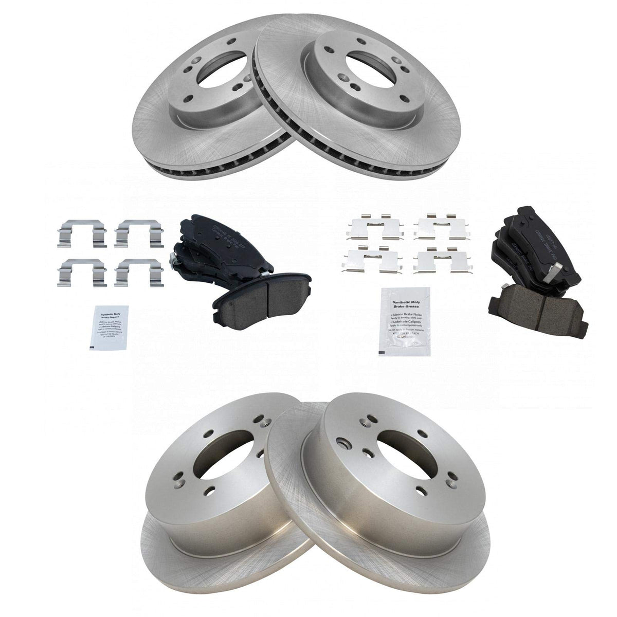 Ceramic Brake Pad & Rotor KitKit Includes(1) Front Ceramic Brake Pad Set(1) Rear Ceramic Brake Pad Set(2) Front Brake Rotors(2) Rear Brake RotorsFitmentCompatible with: 2005-10 Kia Sportage All Wheel Drive Front & RearCompatible with: 2005-09 Hyundai Tucson 4 Wheel Drive Front & RearProduct AttributesFront Brake Rotor Diameter: 11.02 in. (280mm)Rear Brake Rotor Diameter: 11.18 in. (284mm)Wheel Lug Count: 5 LugBrake Pad Friction Material: CeramicBrake Pad Bonding Type: Premium PosiRear Brake Rotor Venting Type: SolidFront Brake Rotor Venting Type: VentedProduct Features Positive Molded - Less dust resulting in clean wheels G3000 Casting Alloy - Reduced noise and improved wear resistance Application Specific Design - Extended service life, no modificationsItem DetailsTRQ brake kits are designed to restore your brake system to like-new performance. TRQ brake pads are positive molded, thermal scorched, chamfered, and utilize a multi-layer shim for enhanced performance and service life. TRQ rotors have a non-directional finish that reduces the break-in period for new rotors as well as reducing vibrations throughout the rotors lifecycle. All products are fit and road-tested in our Massachusetts R&D facility to ensure we deliver on our promise of Trusted Reliable Quality.Reference NumbersAdvance Auto Parts: 145504, N1000118768BRC, YH145504, YH145504C, YH145504PAimco: 31336, 31337Autoxtra: 126141, 80980089AutoZone: 31337, 31337DGBeck/Arnley: 083-2960Bendix: 145504, PRT5504, PRT5534, PRT5831Bosch: 28010811BrakeBest: 28010811, 980089, 980089FZN, 980089R, 980089RGS, BD126141Brembo: 09.9574.10, 09.9574.11, 25930Casting Numbers: 325977Centric Parts: 120.51015, 120.51015CRY, 121.51015, 125.51015, 126.51015CSL, 126.51015CSR, 126.51015SL, 126.51015SR, 127.51015CL, 127.51015CR, 127.51015L, 127.51015R, 128.51015CL, 128.51015CR, 128.51015L, 128.51015R, 227.51015L, 227.51015R, 320.51015Dura Corp: BR31337, BR3133702DuraGo: 900800, BR31336, BR31337, BR3133702Hollander: 530-50126, 533-58612Hyundai: 517122C000, 517122C700, 517122E300, 581012CA10, 581012CA11, 581012EA20, 581012EA21, 581012HA10, 5810138A90, 581013KA61, 5830226A20, 583022EA00, 583022HA00, 5830238A10, 583023KA10, 583023KA50, 583023KA51, 583023KA60Kia: 517121F300, 581012EA21, 581012GA01, 581012KA00, 581012KA51, 581013CA70, 583022EA00, 5830238A10, 583023FA00Mighty Distributing System: 31337Monroe Brakes: BD126141NAPA BRAKES: TSR9464Newtek Automotive USA: 31337PowerStop: JBR1136EVCPromax: 14-31337, 20-31337Qualis: 31337, 31423Raybestos Brakes: 980087, 980087FZN, 980087P, 980087R, 980089, 980089FZN, 980089P, 980089R, EHT813H, EHT924H, MGD813CH, MGD924CH, SGD813C, SGD924CTRW: 4283, DF4283SUAP: 2031337, 31337VIPAR - Vehicle Indusrty Parts & Manufacturing: X51594WABCO - Archived: PS126141Wagner Brake: BD126141, BD126141EWagner: BD126141, BD126201, BD126553Winhere: 6620242
