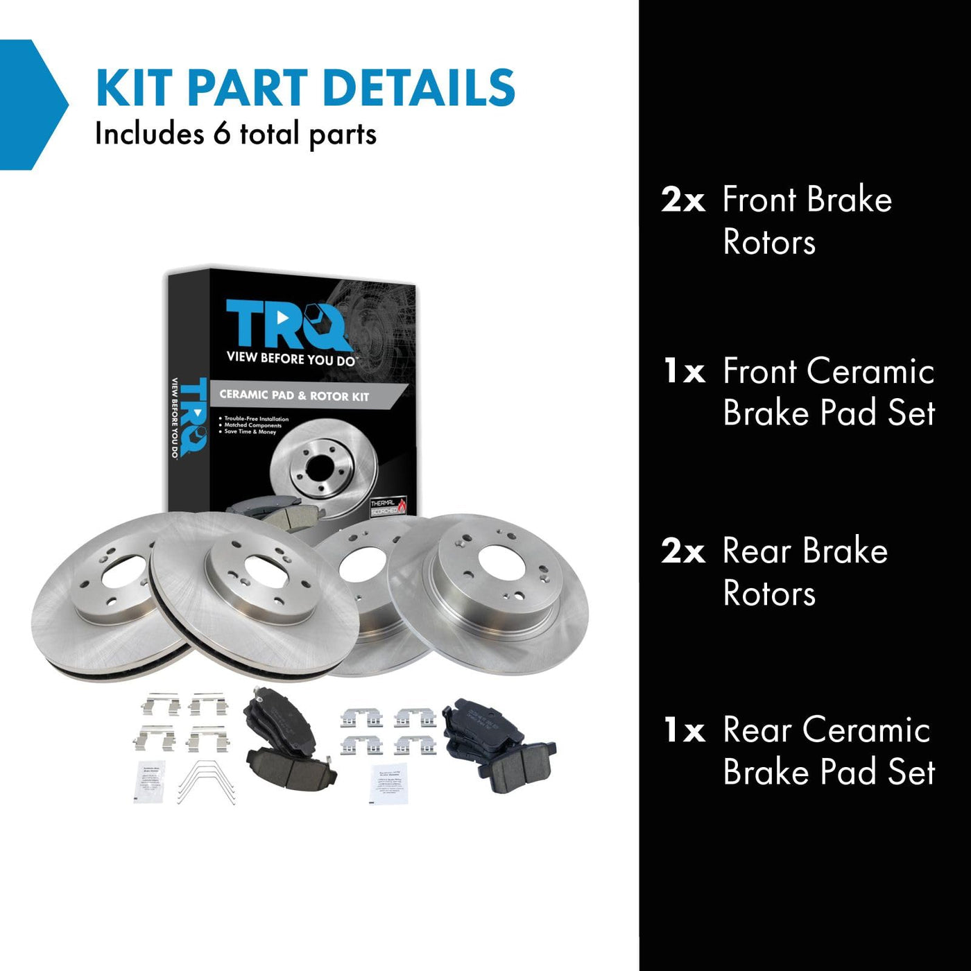 Ceramic Brake Pad & Rotor KitKit Includes(1) Front Ceramic Brake Pad Set(1) Rear Ceramic Brake Pad Set(2) Front Brake Rotors(2) Rear Brake RotorsFitmentCompatible with: 2011-12 Honda Accord EX Front & RearCompatible with: 2011-14 Acura TSX Front & RearProduct AttributesRear Brake Rotor Diameter: 11.10 in. (282mm)Front Brake Rotor Diameter: 11.81 in. (300mm)Wheel Lug Count: 5 LugBrake Pad Friction Material: CeramicBrake Pad Bonding Type: Premium PosiFront Brake Rotor Venting Type: VentedRear Brake Rotor Venting Type: VentedProduct Features Positive Molded - Less dust resulting in clean wheels G3000 Casting Alloy - Reduced noise and improved wear resistance Application Specific Design - Extended service life, no modificationsItem DetailsTRQ brake kits are designed to restore your brake system to like-new performance. TRQ brake pads are positive molded, thermal scorched, chamfered, and utilize a multi-layer shim for enhanced performance and service life. TRQ rotors have a non-directional finish that reduces the break-in period for new rotors as well as reducing vibrations throughout the rotors lifecycle. All products are fit and road-tested in our Massachusetts R&D facility to ensure we deliver on our promise of Trusted Reliable Quality.Reference NumbersAcura: 43022TA0A00, 45022TE0A60, 45022TL2A00Advance Auto Parts: YH200513, YH200513C, YH200513PAimco: 31275, 31479Autopartsource: 572650Autoxtra: AX900520, AX900898AutoZone: 44594, 44594DG, 44594DL, DL44594Bendix: PRT5287, PRT5773, PRT6208Bosch: 26011451BrakeBest: 26011451, 980577FZN, 980577R, 980577RGS, 982003RGSCasting Numbers: 326369Centric Parts: 120.40068, 120.40068CRY, 121.40068, 126.40068CSL, 126.40068CSR, 126.40068SL, 126.40068SR, 127.40068CL, 127.40068CR, 127.40068L, 127.40068R, 128.40068CL, 128.40068CR, 128.40068L, 128.40068R, 227.40068L, 227.40068R, 320.40068Dura Corp: BR900520, BR90052002, BR901464DuraGo: 900520, BR31275, BR900520, BR90052002, BR901464Dynamic Friction Company: 604-59032, 604-59071Eurorotor: HO-5012Hollander: 530-58833, 533-50200, 533-59097Honda: 42510SFY000, 42510T2FA00, 42510T7TM00, 42510T7WA01, 42510T7WA02, 42510TA0A00, 42510TA0A01, 42510TA0A02, 42510TVAA00, 43022TA0A00, 45022TE0A60Monroe Brakes: BD126414NAPA BRAKES: SDK6582Newtek Automotive USA: R1464Promax: 20-31479Qualis: 44594Raybestos Brakes: 96795, 96795FZN, 96795P, 96795PER, 96795R, 980577, 980577FZN, 980577P, 980577R, 980666, 980666FZN, 980666P, 980666R, 982003, EHT1336H, EHT1506H, MGD1336CH, MGD1506CH, SGD1336C, SGD1506CTRW: 4982UAP: 2031479, 31479Ultra Brake: HO-5012WABCO - Archived: PS126414Wagner Brake: BD126414, BD126414E, BD126561, BD180659E, BD180807E, SB980577Wagner: BD125674, BD126414, BD126561