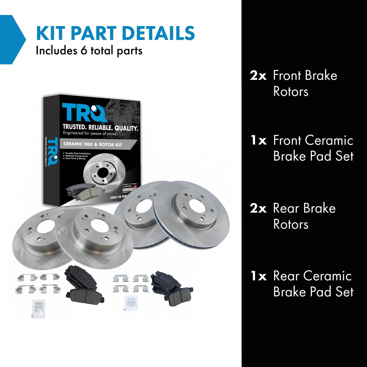 Ceramic Brake Pad & Rotor KitKit Includes(1) Front Ceramic Brake Pad Set(1) Rear Ceramic Brake Pad Set(2) Front Brake Rotors(2) Rear Brake RotorsFitmentCompatible with: 2013-17 Honda Accord EX Front & RearCompatible with: 2013-17 Honda Accord EX-L Front & RearCompatible with: 2013-15 Honda Accord Sport Front & RearCompatible with: 2013-15 Honda Accord Touring Front & RearCompatible with: 2014-15 Honda Accord Hybrid EX-L Front & RearCompatible with: 2014-15 Honda Accord Hybrid Touring Front & RearCompatible with: 2014-15 Honda Accord Hybrid Front & RearCompatible with: 2017 Honda Accord Hybrid Front & RearCompatible with: 2017 Honda Accord Hybrid EX-L Front & RearCompatible with: 2017 Honda Accord Hybrid Touring Front & RearCompatible with: 2014 Honda Accord Plug-In Front & RearCompatible with: 2013 Honda Accord LX-S Front & RearProduct AttributesRear Brake Rotor Diameter: 11.10 in. (282mm)Front Brake Rotor Diameter: 11.54 in. (293mm)Wheel Lug Count: 5 LugBrake Pad Friction Material: CeramicBrake Pad Bonding Type: Premium PosiRear Brake Rotor Venting Type: VentedFront Brake Rotor Venting Type: VentedProduct Features Positive Molded - Less dust resulting in clean wheels G3000 Casting Alloy - Reduced noise and improved wear resistance Application Specific Design - Extended service life, no modificationsItem DetailsTRQ brake kits are designed to restore your brake system to like-new performance. TRQ brake pads are positive molded, thermal scorched, chamfered, and utilize a multi-layer shim for enhanced performance and service life. TRQ rotors have a non-directional finish that reduces the break-in period for new rotors as well as reducing vibrations throughout the rotors lifecycle. All products are fit and road-tested in our Massachusetts R&D facility to ensure we deliver on our promise of Trusted Reliable Quality.Reference NumbersAcura: 43022TA0A00Advance Auto Parts: YH200513, YH200513C, YH200513PAimco: 31479Autopartsource: 572650Autoxtra: AX900520, AX900898AutoZone: 44594, 44594DG, 44594DL, DL44594Bendix: PRT5773, PRT6207, PRT6208Bosch: 26011451BrakeBest: 26011451, 980577FZN, 980577R, 980577RGS, 982003RGSCasting Numbers: 326369Centric Parts: 120.40068, 120.40068CRY, 120.40086, 121.40068, 126.40068CSL, 126.40068CSR, 126.40068SL, 126.40068SR, 127.40068CL, 127.40068CR, 127.40068L, 127.40068R, 128.40068CL, 128.40068CR, 128.40068L, 128.40068R, 227.40068L, 227.40068R, 320.40068Dura Corp: BR900520, BR90052002, BR901464DuraGo: 900520, BR900520, BR90052002, BR901178, BR901464Dynamic Friction Company: 604-59032, 604-59071Eurorotor: HO-5012Hollander: 533-50200, 533-59097Honda: 42510SFY000, 42510T2FA00, 42510T7TM00, 42510T7WA01, 42510T7WA02, 42510TA0A00, 42510TA0A01, 42510TA0A02, 42510TVAA00, 43022TA0A00, 45022T2GA00, 45022T2GA01, 45022T3ZA01, 45022TVAA00, 45251T2FA50, 45251T2FA51, 45251T2GA00, 45251T3VA00, 45251T3VA01, 45251T7WA02, 45251T8MG01Monroe Brakes: BD126414NAPA BRAKES: SDK6582Newtek Automotive USA: R1464Promax: 20-31479Qualis: 44594Raybestos Brakes: 980577, 980577FZN, 980577P, 980577R, 981022, 981022FZN, 981022P, 981022R, 981037, 981037FZN, 981037P, 981037R, 982003, EHT1336H, EHT1654H, MGD1336CH, MGD1654CH, SGD1336C, SGD1654CTRW: 4982UAP: 2031479, 31479Ultra Brake: HO-5012WABCO - Archived: PS126414Wagner Brake: BD126414, BD126414E, BD126561, BD180659E, BD180807E, SB980577Wagner: BD126414, BD126561, BD180567, BD180583