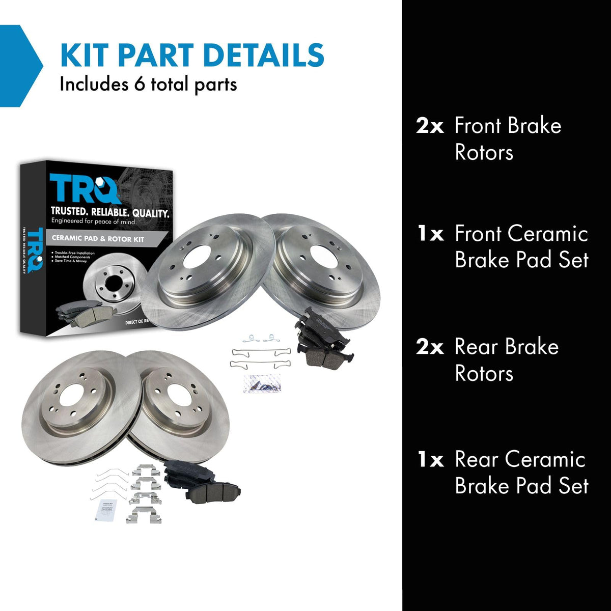 Ceramic Brake Pad & Rotor KitKit Includes(1) Front Ceramic Brake Pad Set(1) Rear Ceramic Brake Pad Set(2) Front Brake Rotors(2) Rear Brake RotorsFitmentCompatible with: 2019-20 Acura RDX Front & RearProduct AttributesRear Brake Rotor Diameter: 12.20 in. (310mm)Front Brake Rotor Diameter: 12.40 in. (315mm)Wheel Lug Count: 5 LugBrake Pad Friction Material: CeramicBrake Pad Bonding Type: Premium PosiRear Brake Rotor Venting Type: SolidFront Brake Rotor Venting Type: VentedProduct Features Positive Molded - Less dust resulting in clean wheels G3000 Casting Alloy - Reduced noise and improved wear resistance Application Specific Design - Extended service life, no modificationsItem DetailsTRQ brake kits are designed to restore your brake system to like-new performance. TRQ brake pads are positive molded, thermal scorched, chamfered, and utilize a multi-layer shim for enhanced performance and service life. TRQ rotors have a non-directional finish that reduces the break-in period for new rotors as well as reducing vibrations throughout the rotors lifecycle. All products are fit and road-tested in our Massachusetts R&D facility to ensure we deliver on our promise of Trusted Reliable Quality.Reference NumbersDurabrake: BR901720, BR901722Honda: 43022TBAA02, 43022TGHA01, 45022T0AA00, 45022T0AA01, 45022TK8A00, 45022TK8A01, 45022TP6A60, 45022TP6A61Raybestos Brakes: 982434, 982434FZN, 982434P, 982434R, 982435R, EHT1521H, EHT1878H, MGD1521CH, MGD1878CH, SGD1521CSubaru: 26296AL03A