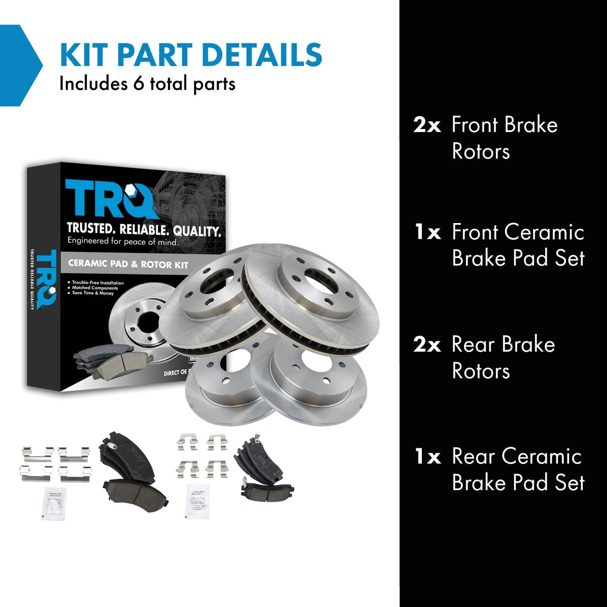Ceramic Brake Pad & Rotor KitKit Includes(1) Front Ceramic Brake Pad Set(1) Rear Ceramic Brake Pad Set(2) Front Brake Rotors(2) Rear Brake RotorsFitmentCompatible with: 1997-03 Pontiac Grand Prix Front & RearCompatible with: 1997-04 Buick Regal Front & RearCompatible with: 2004-05 Buick Century Front & RearCompatible with: 2002-04 Pontiac Montana Front Wheel Drive Front & RearCompatible with: 2000-02 Olds Intrigue Front & RearCompatible with: 1999-01 Pontiac Montana Front & RearCompatible with: 2005 Pontiac Montana Base Model Front & RearCompatible with: 1998-99 Olds Intrigue Front & Rear with RPO Code JB9 Light Duty BrakesCompatible with: 1997-98 Pontiac Trans Sport Front & RearProduct AttributesRear Brake Rotor Diameter: 10.94 in. (278mm)Wheel Lug Count: 5 LugBrake Pad Friction Material: CeramicBrake Pad Bonding Type: Premium PosiRear Brake Rotor Venting Type: SolidProduct Features Positive Molded - Less dust resulting in clean wheels G3000 Casting Alloy - Reduced noise and improved wear resistance Application Specific Design - Extended service life, no modificationsItem DetailsTRQ brake kits are designed to restore your brake system to like-new performance. TRQ brake pads are positive molded, thermal scorched, chamfered, and utilize a multi-layer shim for enhanced performance and service life. TRQ rotors have a non-directional finish that reduces the break-in period for new rotors as well as reducing vibrations throughout the rotors lifecycle. All products are fit and road-tested in our Massachusetts R&D facility to ensure we deliver on our promise of Trusted Reliable Quality.Reference NumbersAimco: 55036, 55039Autopart International: 1412-36526Bendix: PRT5155, PRT5250Buick: 18023377, 18029844, 19152498Cadillac: 18029827Chevrolet: 18023377, 18029828DuraGo: BR55036, BR55039Hollander: 530-01981, 533-02339Oldsmobile: 18023377, 18029827, 18029844Pontiac: 18023377, 18029844, 19152498Raybestos Brakes: 56629, 56629FZN, 56629P, 56629R, 56631, 56631FZN, 56631P, 56631R, EHT698H, EHT699H, MGD698CH, MGD699CH, SGD698C, SGD699CWagner: BD125506, BD125507