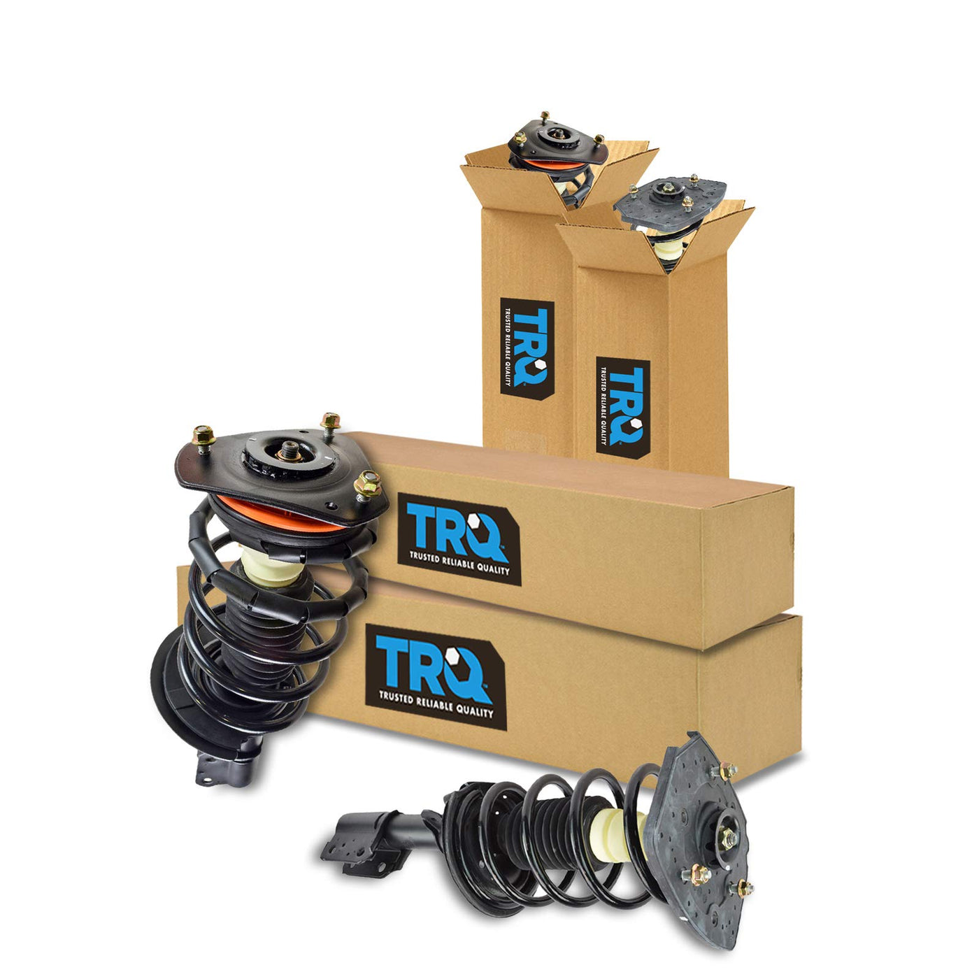Q: How many pieces are included in the TRQ Strut & Spring Assembly Set?A: The TRQ Strut & Spring Assembly Set includes a total of 4 pieces: 2 front strut & spring assemblies and 2 rear strut & spring assemblies.