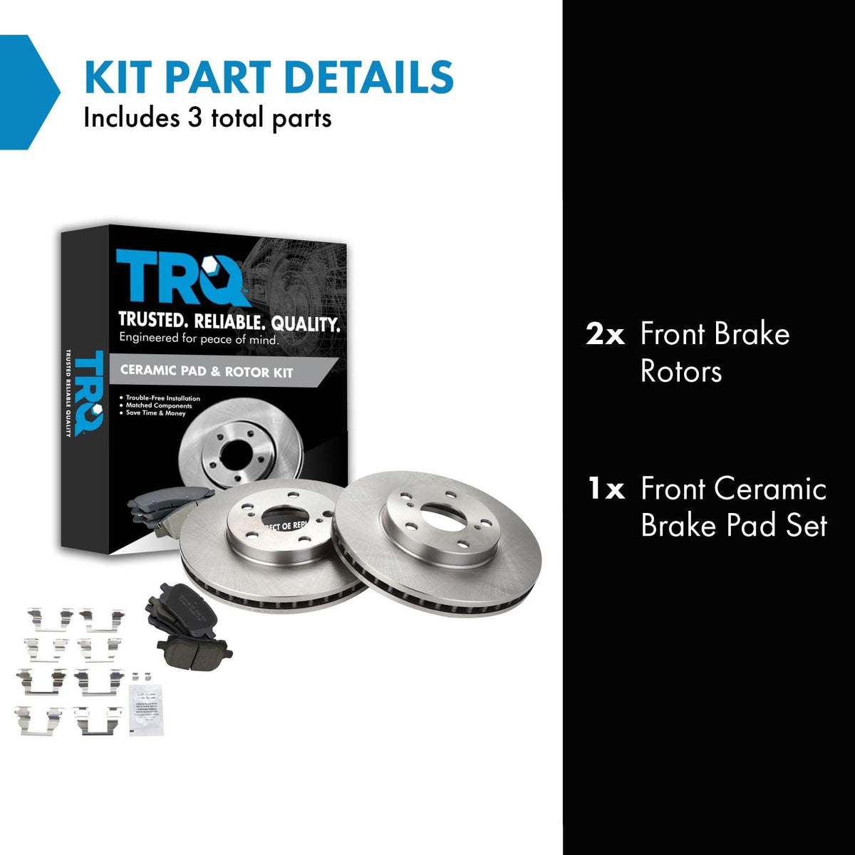 Ceramic Brake Pad & Rotor KitKit Includes(1) Front Ceramic Brake Pad Set(2) Front Brake RotorsFitmentCompatible with: 1997-01 Toyota Camry V6 3.0L FrontCompatible with: 1998-04 Toyota Avalon FrontCompatible with: 1997-01 Lexus ES300 FrontCompatible with: 1999-03 Toyota Solara FrontProduct AttributesFront Brake Rotor Diameter: 10.83 in. (275mm)Wheel Lug Count: 5 LugBrake Pad Friction Material: CeramicBrake Pad Bonding Type: Premium PosiFront Brake Rotor Venting Type: VentedProduct Features Positive Molded - Less dust resulting in clean wheels G3000 Casting Alloy - Reduced noise and improved wear resistance Application Specific Design - Extended service life, no modificationsItem DetailsTRQ brake kits are designed to restore your brake system to like-new performance. TRQ brake pads are positive molded, thermal scorched, chamfered, and utilize a multi-layer shim for enhanced performance and service life. TRQ rotors have a non-directional finish that reduces the break-in period for new rotors as well as reducing vibrations throughout the rotors lifecycle. All products are fit and road-tested in our Massachusetts R&D facility to ensure we deliver on our promise of Trusted Reliable Quality.Reference NumbersAimco: 31050Bendix: PRT1723DuraGo: BR31050Hollander: 530-58456, 530-58498Lexus: 446533120, 446533180, 446533230, 446548010Raybestos Brakes: 96217, 96217FZN, 96217P, 96217R, 96754R, EHT707H, MGD707CH, SGD707CToyota: 446533120, 446533121Wagner: BD125223, BD126580
