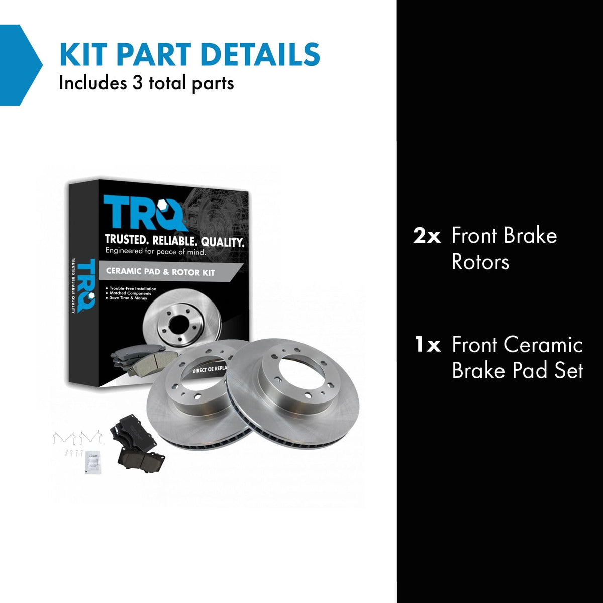 Ceramic Brake Pad & Rotor KitKit Includes(1) Front Ceramic Brake Pad Set(2) Front Brake RotorsFitmentCompatible with: 2005-20 Toyota Tacoma Front with 6 Lug WheelsCompatible with: 2021-22 Toyota Tacoma FrontCompatible with: 2003-09 Toyota 4Runner Front with Caliper Casting #13WGCompatible with: 2007-14 Toyota FJ Cruiser FrontProduct AttributesFront Brake Rotor Diameter: 12.56 in. (319mm)Wheel Lug Count: 6 LugBrake Pad Friction Material: CeramicBrake Pad Bonding Type: Premium PosiFront Brake Rotor Venting Type: VentedProduct Features Positive Molded - Less dust resulting in clean wheels G3000 Casting Alloy - Reduced noise and improved wear resistance Application Specific Design - Extended service life, no modificationsItem DetailsTRQ brake kits are designed to restore your brake system to like-new performance. TRQ brake pads are positive molded, thermal scorched, chamfered, and utilize a multi-layer shim for enhanced performance and service life. TRQ rotors have a non-directional finish that reduces the break-in period for new rotors as well as reducing vibrations throughout the rotors lifecycle. All products are fit and road-tested in our Massachusetts R&D facility to ensure we deliver on our promise of Trusted Reliable Quality.Reference NumbersAimco: 31327Bendix: PRT5458, PRT5819DuraGo: BR31327Lexus: 446535250, 446535290, 446560320Mitsubishi: 4605A481Raybestos Brakes: 980161, 980161FZN, 980161P, 980161PER, 980161R, 980670, 980670FZN, 980670P, 980670PER, 980670R, EHT976H, MGD976CH, SGD976CToyota: 044650K280, 044650K390, 446504070, 446504090, 446535290, 446560320Wagner: BD126090, BD126569