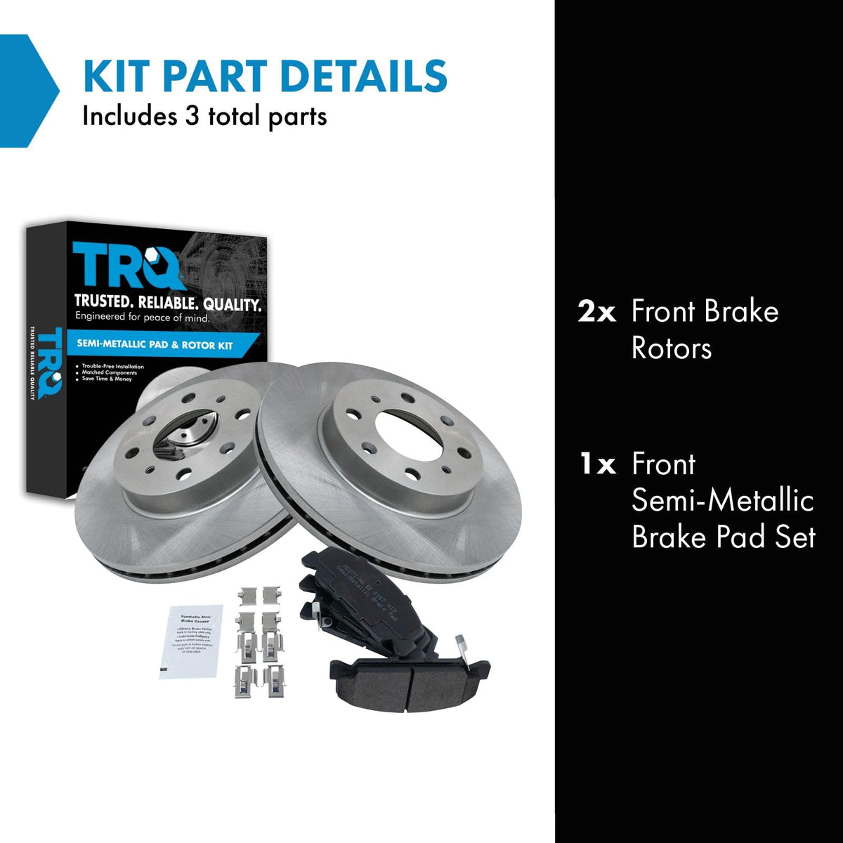 Semi-Metallic Brake Pad & Rotor KitKit Includes(1) Front Semi-Metallic Brake Pad Set(2) Front Brake RotorsFitmentCompatible with: 1996-00 Honda Civic HX L4 1.6L Front without ABS BrakesCompatible with: 1996-00 Honda Civic LX L4 1.6L Front without ABS BrakesCompatible with: 1996-00 Honda Civic DX L4 1.6L Front without ABS BrakesCompatible with: 1996-00 Honda Civic CX L4 1.6L Front without ABS BrakesCompatible with: 1998-00 Honda Civic GX L4 1.6L Front without ABS BrakesCompatible with: 1999 Honda Civic Value Package L4 1.6L Front without ABS BrakesCompatible with: 1994-95 Honda Civic DX L4 1.5L Front with Rear Drum BrakesCompatible with: 1994-95 Honda Civic VX L4 1.5L Front with Rear Drum BrakesCompatible with: 1994-95 Honda Civic LX L4 1.5L Front with Rear Drum BrakesCompatible with: 1994-95 Honda Civic CX L4 1.5L Front with Rear Drum BrakesCompatible with: 1990-91 Honda Civic LX L4 1.5L FrontCompatible with: 1990-91 Honda Civic Base Model L4 1.5L FrontCompatible with: 1990-91 Honda Civic DX L4 1.5L FrontCompatible with: 1993 Honda Civic LX L4 1.5L FrontCompatible with: 1993 Honda Civic DX L4 1.5L FrontCompatible with: 1993 Honda Civic CX L4 1.5L FrontCompatible with: 1993 Honda Civic VX L4 1.5L FrontCompatible with: 1992 Honda Civic Front with Rear Drum BrakesCompatible with: 1994-97 Honda Civic Del Sol excluding VTEC Front without ABS BrakesCompatible with: 1990-91 Honda CRX Base Model L4 1.5L FrontCompatible with: 1993 Honda Civic Del Sol excluding VTEC FrontProduct AttributesWheel Lug Count: 4 LugFront Brake Rotor Diameter: 9.41 in. (239mm)Brake Pad Bonding Type: Premium PosiBrake Pad Friction Material: Semi-MetallicFront Brake Rotor Venting Type: VentedProduct Features Positive Molded - Less dust resulting in clean wheels G3000 Casting Alloy - Reduced noise and improved wear resistance Application Specific Design - Extended service life, no modificationsItem DetailsTRQ brake kits are designed to restore your brake system to like-new performance. TRQ brake pads are positive molded, thermal scorched, chamfered, and utilize a multi-layer shim for enhanced performance and service life. TRQ rotors have a non-directional finish that reduces the break-in period for new rotors as well as reducing vibrations throughout the rotors lifecycle. All products are fit and road-tested in our Massachusetts R&D facility to ensure we deliver on our promise of Trusted Reliable Quality.Reference NumbersAimco: 31029Bendix: PRT1581DuraGo: BR31029Hollander: 530-58296Honda: 45022SA6505Raybestos Brakes: 96147, 96147FZN, 96147P, 96147R, EHT273HWagner: BD125006