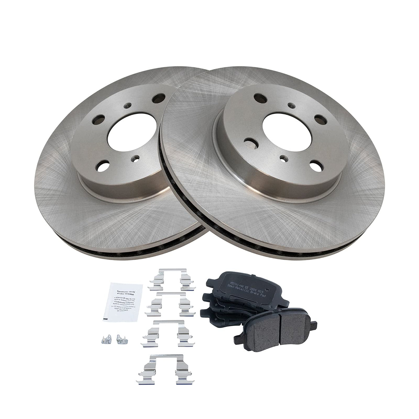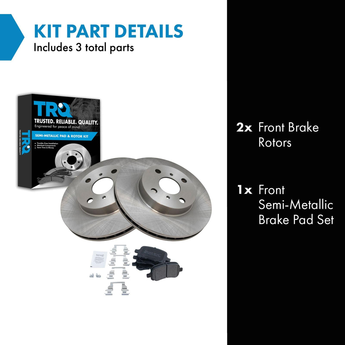 Semi-Metallic Brake Pad & Rotor KitKit Includes(1) Front Semi-Metallic Brake Pad Set(2) Front Brake RotorsFitmentCompatible with: 1998-02 Toyota Corolla FrontCompatible with: 1998-02 Chevrolet Prizm FrontProduct AttributesBrake Pad Bonding Type: Premium PosiBrake Pad Friction Material: Semi-MetallicProduct Features Positive Molded - Less dust resulting in clean wheels G3000 Casting Alloy - Reduced noise and improved wear resistance Application Specific Design - Extended service life, no modificationsItem DetailsTRQ brake kits are designed to restore your brake system to like-new performance. TRQ brake pads are positive molded, thermal scorched, chamfered, and utilize a multi-layer shim for enhanced performance and service life. TRQ rotors have a non-directional finish that reduces the break-in period for new rotors as well as reducing vibrations throughout the rotors lifecycle. All products are fit and road-tested in our Massachusetts R&D facility to ensure we deliver on our promise of Trusted Reliable Quality.Reference NumbersAimco: 31056Bendix: PRT1869Chevrolet: 94858660, 94858664DuraGo: BR31056Raybestos Brakes: 96354, 96354FZN, 96354P, 96354R, EHT741HToyota: 446502010Wagner: BD125326