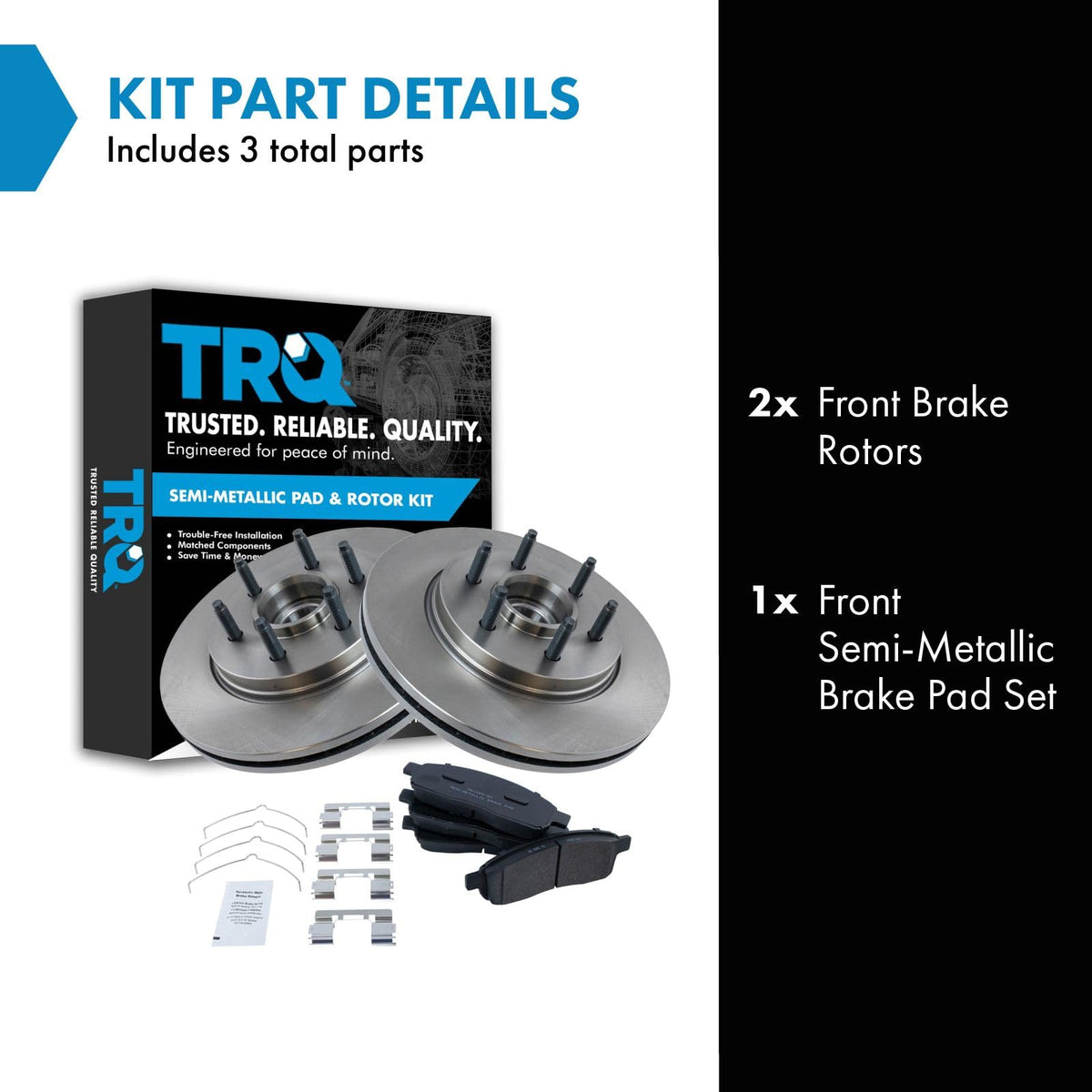Semi-Metallic Brake Pad & Rotor KitKit Includes(1) Front Semi-Metallic Brake Pad Set(2) Front Brake RotorsFitmentCompatible with: 2005-08 Ford F150 Truck Rear Wheel Drive Front with 6 Lug WheelsCompatible with: 2004 Ford F150 Truck Rear Wheel Drive 11th Vin Digit K Front with 6 Lug WheelsCompatible with: 2004 Ford F150 Truck Rear Wheel Drive 11th Vin Digit N Front with 6 Lug WheelsCompatible with: 2004 Ford F150 Truck Rear Wheel Drive 11th Vin Digit F Front with 6 Lug WheelsCompatible with: 2006-08 Lincoln Mark LT Rear Wheel Drive Front with 6 Lug WheelsProduct AttributesFront Brake Rotor Diameter: 12.99 in. (330mm)Wheel Lug Count: 6 LugBrake Pad Bonding Type: Premium PosiBrake Pad Friction Material: Semi-MetallicFront Brake Rotor Venting Type: VentedProduct Features Positive Molded - Less dust resulting in clean wheels G3000 Casting Alloy - Reduced noise and improved wear resistance Application Specific Design - Extended service life, no modificationsItem DetailsTRQ brake kits are designed to restore your brake system to like-new performance. TRQ brake pads are positive molded, thermal scorched, chamfered, and utilize a multi-layer shim for enhanced performance and service life. TRQ rotors have a non-directional finish that reduces the break-in period for new rotors as well as reducing vibrations throughout the rotors lifecycle. All products are fit and road-tested in our Massachusetts R&D facility to ensure we deliver on our promise of Trusted Reliable Quality.Reference NumbersAimco: 54107Bendix: PRT5519DuraGo: BR54107Ford: 4L3Z2001AD, 5L3Z2001A, 6L3Z2001AHollander: 530-02152Lincoln: 5L3Z2001A, 6L3Z2001ARaybestos Brakes: 680178, 680178FZN, 680178P, 680178R, EHT1083HWagner: BD126116