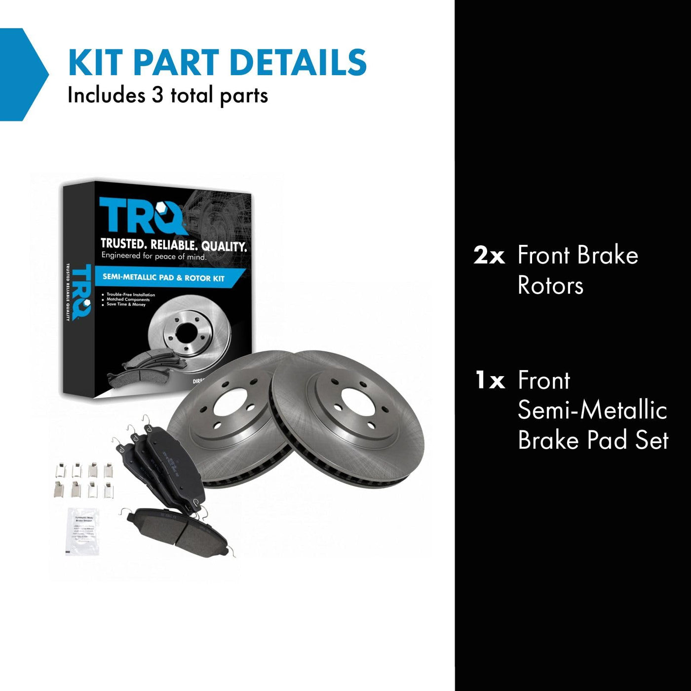 Semi-Metallic Brake Pad & Rotor KitKit Includes(1) Front Semi-Metallic Brake Pad Set(2) Front Brake RotorsFitmentCompatible with: 2005-10 Ford Mustang V8 4.6L FrontCompatible with: 2011-14 Ford Mustang V6 3.7L FrontProduct AttributesFront Brake Rotor Diameter: 12.44 in. (316mm)Wheel Lug Count: 5 LugBrake Pad Bonding Type: Premium PosiBrake Pad Friction Material: Semi-MetallicFront Brake Rotor Venting Type: VentedProduct Features Positive Molded - Less dust resulting in clean wheels G3000 Casting Alloy - Reduced noise and improved wear resistance Application Specific Design - Extended service life, no modificationsItem DetailsTRQ brake kits are designed to restore your brake system to like-new performance. TRQ brake pads are positive molded, thermal scorched, chamfered, and utilize a multi-layer shim for enhanced performance and service life. TRQ rotors have a non-directional finish that reduces the break-in period for new rotors as well as reducing vibrations throughout the rotors lifecycle. All products are fit and road-tested in our Massachusetts R&D facility to ensure we deliver on our promise of Trusted Reliable Quality.Reference NumbersAimco: 54134Bendix: PRT5658DuraGo: BR54134Ford: 4R3Z2001BA, 6R3Z2001A, 7R3Z2001B, 8R3Z2001A, 9R3Z2001AHollander: 530-02168Raybestos Brakes: 680326, 680326FZN, 680326P, 680326PER, 680326R, EHT1081HWagner: BD126211