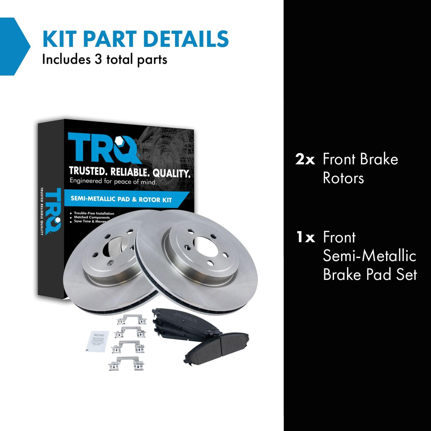 Semi-Metallic Brake Pad & Rotor KitKit Includes(1) Front Semi-Metallic Brake Pad Set(2) Front Brake RotorsFitmentCompatible with: 2006-19 Dodge Charger Front with 13.6 in. 345mm Diameter Front RotorsCompatible with: 2005-19 Chrysler 300 Front with 13.6 in. 345mm Diameter Front RotorsCompatible with: 2009-19 Dodge Challenger Front with 13.6 in. 345mm Diameter Front RotorsCompatible with: 2005-08 Dodge Magnum Front with 13.6 in. 345mm Diameter Front RotorsProduct AttributesFront Brake Rotor Diameter: 13.58 in. (345mm)Wheel Lug Count: 5 LugBrake Pad Bonding Type: Premium PosiBrake Pad Friction Material: Semi-MetallicFront Brake Rotor Venting Type: VentedProduct Features Positive Molded - Less dust resulting in clean wheels G3000 Casting Alloy - Reduced noise and improved wear resistance Application Specific Design - Extended service life, no modificationsItem DetailsTRQ brake kits are designed to restore your brake system to like-new performance. TRQ brake pads are positive molded, thermal scorched, chamfered, and utilize a multi-layer shim for enhanced performance and service life. TRQ rotors have a non-directional finish that reduces the break-in period for new rotors as well as reducing vibrations throughout the rotors lifecycle. All products are fit and road-tested in our Massachusetts R&D facility to ensure we deliver on our promise of Trusted Reliable Quality.Reference NumbersAimco: 53023Bendix: PRT5651Chrysler: 05137666AA, 05142558AA, 05142558AB, 05142558AB*, 05142559AA, 05142559AB, 68147681AADodge: 05142558AA, 05142558AB, 05142558AB*, 05142559AA, 05142559AB, 05175208AA, 68147681AA, 68147681AB, 68209532AA, 68269953AADuraGo: BR53023Hollander: 530-02182Raybestos Brakes: 780256, 780256FZN, 780256P, 780256PER, 780256R, EHT1058HWagner: BD126269