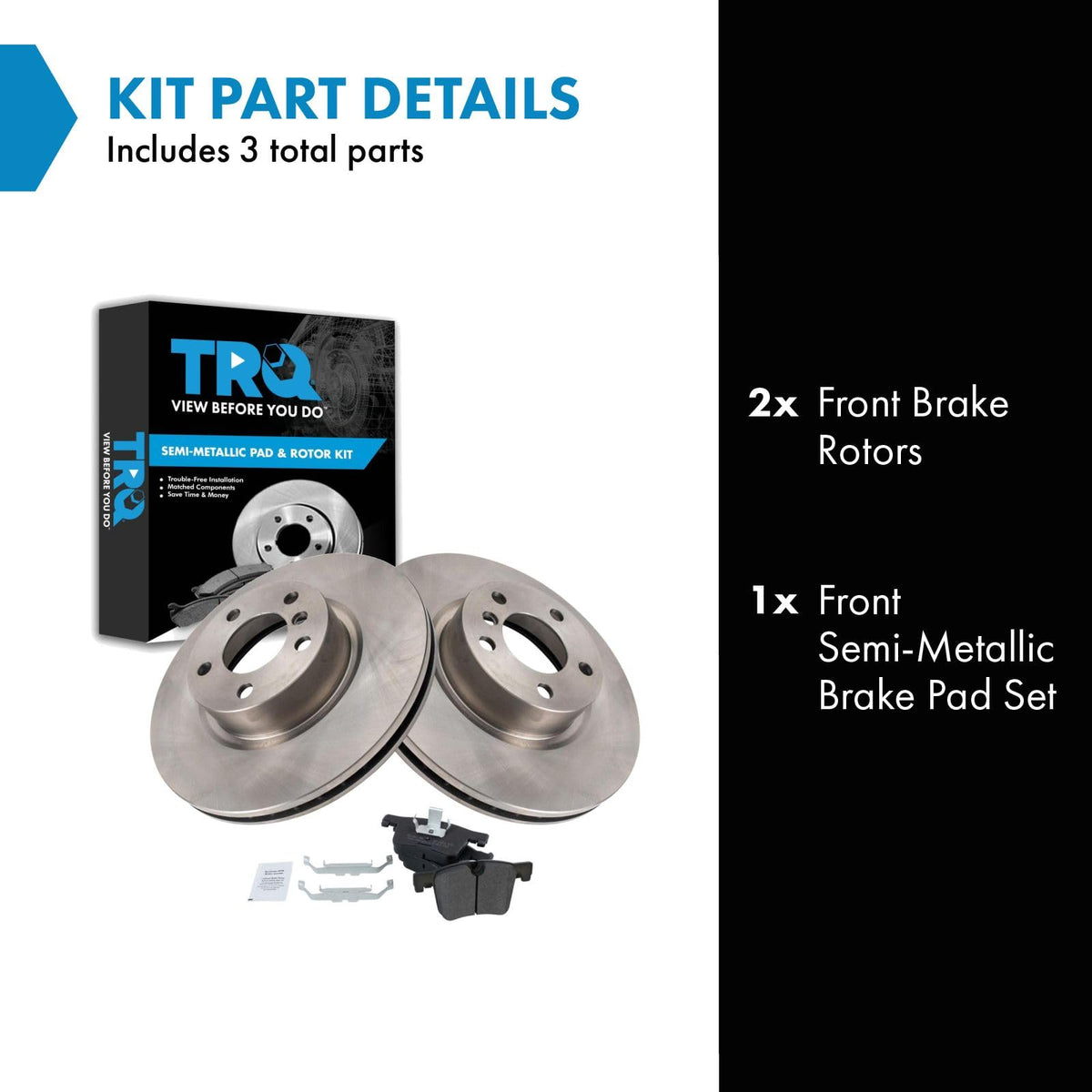 Semi-Metallic Brake Pad & Rotor KitKit Includes(1) Front Semi-Metallic Brake Pad Set(2) Front Brake RotorsFitmentCompatible with: 2017 BMW X3 FrontCompatible with: 2016 BMW X3 FrontCompatible with: 2014 BMW X3 FrontCompatible with: 2013 BMW X3 FrontCompatible with: 2015 BMW X3 FrontCompatible with: 2011 BMW X3 FrontCompatible with: 2012 BMW X3 FrontCompatible with: 2016 BMW X4 xDrive35i FrontCompatible with: 2016 BMW X4 xDrive28i FrontCompatible with: 2018 BMW X4 xDrive28i FrontCompatible with: 2015 BMW X4 xDrive35i FrontCompatible with: 2015 BMW X4 xDrive28i FrontCompatible with: 2017 BMW X4 xDrive28i FrontProduct AttributesBrake Pad Bonding Type: Premium PosiBrake Pad Friction Material: Semi-MetallicProduct Features Positive Molded - Less dust resulting in clean wheels G3000 Casting Alloy - Reduced noise and improved wear resistance Application Specific Design - Extended service life, no modificationsItem DetailsTRQ brake kits are designed to restore your brake system to like-new performance. TRQ brake pads are positive molded, thermal scorched, chamfered, and utilize a multi-layer shim for enhanced performance and service life. TRQ rotors have a non-directional finish that reduces the break-in period for new rotors as well as reducing vibrations throughout the rotors lifecycle. All products are fit and road-tested in our Massachusetts R&D facility to ensure we deliver on our promise of Trusted Reliable Quality.Reference NumbersAimco: 34488BMW: 34106799801, 34106856191, 34106859181, 34114073936, 34116854126DuraGo: BR901050Raybestos Brakes: 980925, 980925FZN, 980925P, 980925R, MGD1561M, PGD1561M, SP1561EU