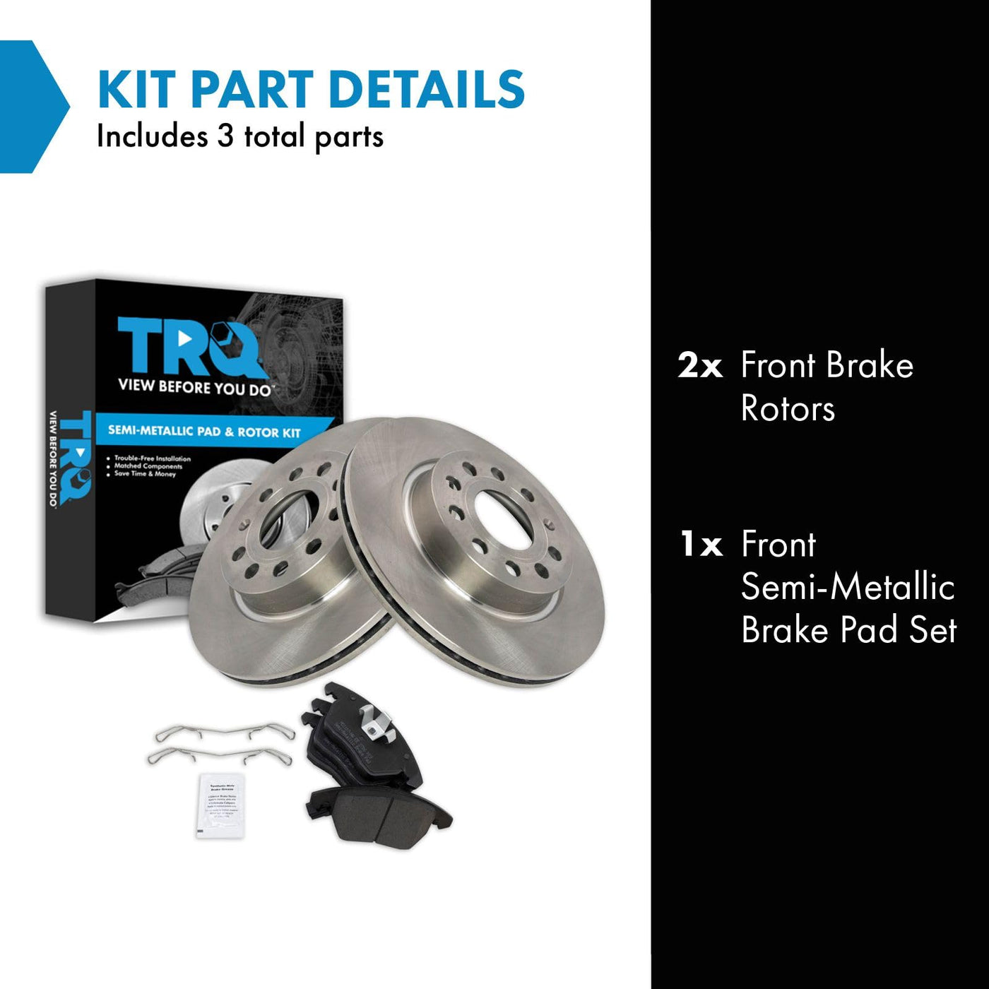 Semi-Metallic Brake Pad & Rotor KitKit Includes(1) Front Semi-Metallic Brake Pad Set(2) Front Brake RotorsFitmentCompatible with: 2011 VW Jetta TDI L4 2.0L Front with 280 mm Diameter Front RotorsCompatible with: 2011 VW Jetta SE L5 2.5L Front with 280 mm Diameter Front RotorsCompatible with: 2011 VW Jetta S L5 2.5L Front with 280 mm Diameter Front RotorsCompatible with: 2011 VW Jetta SEL L5 2.5L Front with 280 mm Diameter Front RotorsCompatible with: 2013 VW GTI Front with 280 mm Diameter Front RotorsCompatible with: 2011 Audi A3 Front with 280 mm Diameter Front RotorsCompatible with: 2011 Audi A3 Quattro Front with 280 mm Diameter Front RotorsProduct AttributesBrake Pad Bonding Type: Premium PosiBrake Pad Friction Material: Semi-MetallicProduct Features Positive Molded - Less dust resulting in clean wheels G3000 Casting Alloy - Reduced noise and improved wear resistance Application Specific Design - Extended service life, no modificationsItem DetailsTRQ brake kits are designed to restore your brake system to like-new performance. TRQ brake pads are positive molded, thermal scorched, chamfered, and utilize a multi-layer shim for enhanced performance and service life. TRQ rotors have a non-directional finish that reduces the break-in period for new rotors as well as reducing vibrations throughout the rotors lifecycle. All products are fit and road-tested in our Massachusetts R&D facility to ensure we deliver on our promise of Trusted Reliable Quality.Reference NumbersAimco: 34491, 34501Audi: 1K0698151E, 3C0698151A, 5K0698151Bendix: PRT6154DuraGo: BR901074Peugeot: 425260Raybestos Brakes: 980929, 980929FZN, 980929P, 980929R, 980948, 980948FZN, 980948P, 980948R, EHT1107H, SP1107EUH, SP1107XPHVolkswagen: 3C0698151A, 5C0698151A, 5K0698151Wagner: BD180426, BD180523
