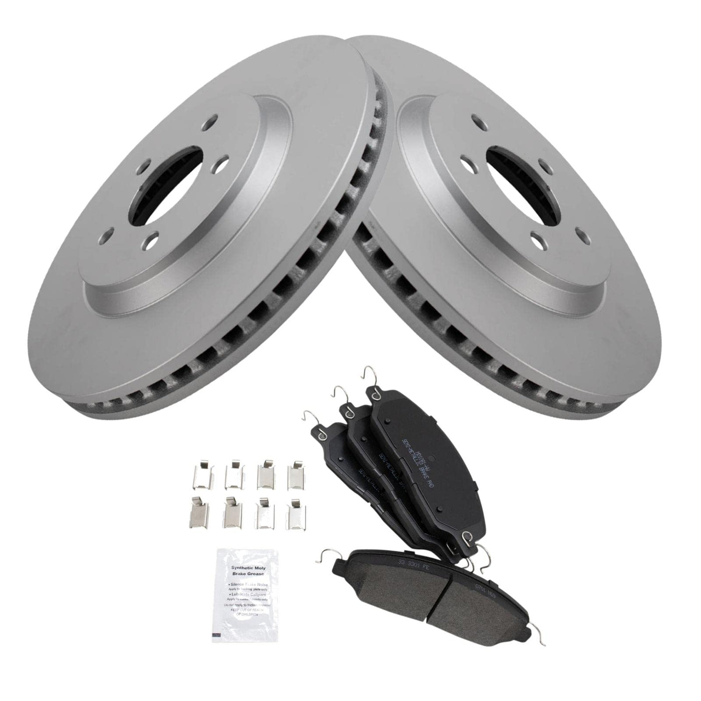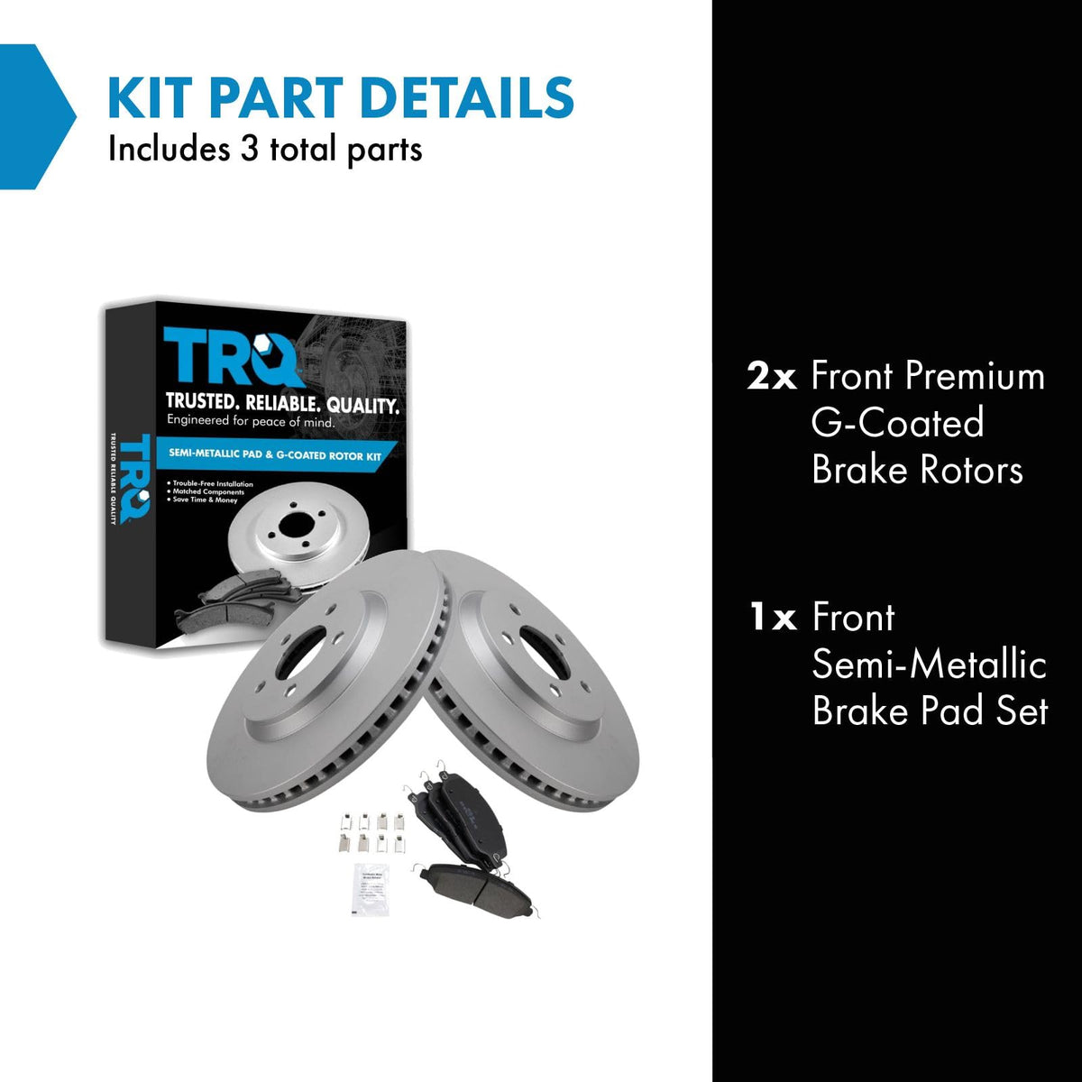 Semi-Metallic Brake Pad & Rotor KitKit Includes(1) Front Semi-Metallic Brake Pad Set(2) Front Premium G-Coated Brake RotorsFitmentCompatible with: 2005-10 Ford Mustang V8 4.6L Front Semi-Metallic Premium G-Coated Brake Pad & Rotor KitCompatible with: 2011-14 Ford Mustang V6 3.7L Front Semi-Metallic Premium G-Coated Brake Pad & Rotor KitProduct AttributesFront Brake Rotor Diameter: 12.44 in. (316mm)Wheel Lug Count: 5 LugBrake Rotor Coating: Premium G-CoatedBrake Pad Bonding Type: Premium PosiBrake Pad Friction Material: Semi-MetallicFront Brake Rotor Venting Type: VentedProduct Features Positive Molded: Less dust resulting in clean wheels Electrostatic Coated: Long-lasting rust protection G3000 Casting Alloy: Reduced noise and improved wear resistance Application Specific Design: Extended service life, no modificationsItem DetailsTRQ brake kits are designed to restore your brake system to like-new performance. TRQ brake pads are positive molded, thermal scorched, chamfered, and utilize a multi-layer shim for enhanced performance and service life. TRQ G-coated rotors have long-lasting rust prevention, perfect for wheels with large openings that expose the rotor and rotor hat during daily drives. All products are fit and road-tested in our Massachusetts R&D facility to ensure we deliver on our promise of Trusted Reliable Quality.Reference NumbersAimco: 54134Ford: 4R3Z2001BA, 6R3Z2001A, 7R3Z2001B, 8R3Z2001A, 9R3Z2001ARaybestos Brakes: EHT1081H