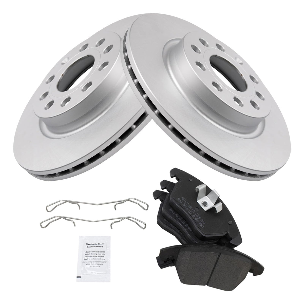 Semi-Metallic Brake Pad & Rotor KitKit Includes(1) Front Semi-Metallic Brake Pad Set(2) Front G-Coated Brake RotorsFitmentCompatible with: 2011 VW Jetta SEL L5 2.5L Front with 280 mm Diameter Front Rotors Semi-Metallic Premium G-Coated Brake Pad & Rotor KitCompatible with: 2011 VW Jetta TDI L4 2.0L Front with 280 mm Diameter Front Rotors Semi-Metallic Premium G-Coated Brake Pad & Rotor KitCompatible with: 2011 VW Jetta S L5 2.5L Front with 280 mm Diameter Front Rotors Semi-Metallic Premium G-Coated Brake Pad & Rotor KitCompatible with: 2011 VW Jetta SE L5 2.5L Front with 280 mm Diameter Front Rotors Semi-Metallic Premium G-Coated Brake Pad & Rotor KitCompatible with: 2013 VW GTI Front with 280 mm Diameter Front Rotors Semi-Metallic Premium G-Coated Brake Pad & Rotor KitCompatible with: 2011 Audi A3 Front with 280 mm Diameter Front Rotors Semi-Metallic Premium G-Coated Brake Pad & Rotor KitCompatible with: 2011 Audi A3 Quattro Front with 280 mm Diameter Front Rotors Semi-Metallic Premium G-Coated Brake Pad & Rotor KitProduct AttributesBrake Rotor Coating: Premium G-CoatedBrake Pad Bonding Type: Premium PosiBrake Pad Friction Material: Semi-MetallicProduct Features Positive Molded: Less dust resulting in clean wheels Electrostatic Coated: Long-lasting rust protection G3000 Casting Alloy: Reduced noise and improved wear resistance Application Specific Design: Extended service life, no modificationsItem DetailsTRQ brake kits are designed to restore your brake system to like-new performance. TRQ brake pads are positive molded, thermal scorched, chamfered, and utilize a multi-layer shim for enhanced performance and service life. TRQ G-coated rotors have long-lasting rust prevention, perfect for wheels with large openings that expose the rotor and rotor hat during daily drives. All products are fit and road-tested in our Massachusetts R&D facility to ensure we deliver on our promise of Trusted Reliable Quality.Reference NumbersAimco: 34501Audi: 1K0698151E, 3C0698151A, 5K0698151Peugeot: 425260Raybestos Brakes: EHT1107H, SP1107EUH, SP1107XPHVolkswagen: 3C0698151A, 5C0698151A, 5K0698151
