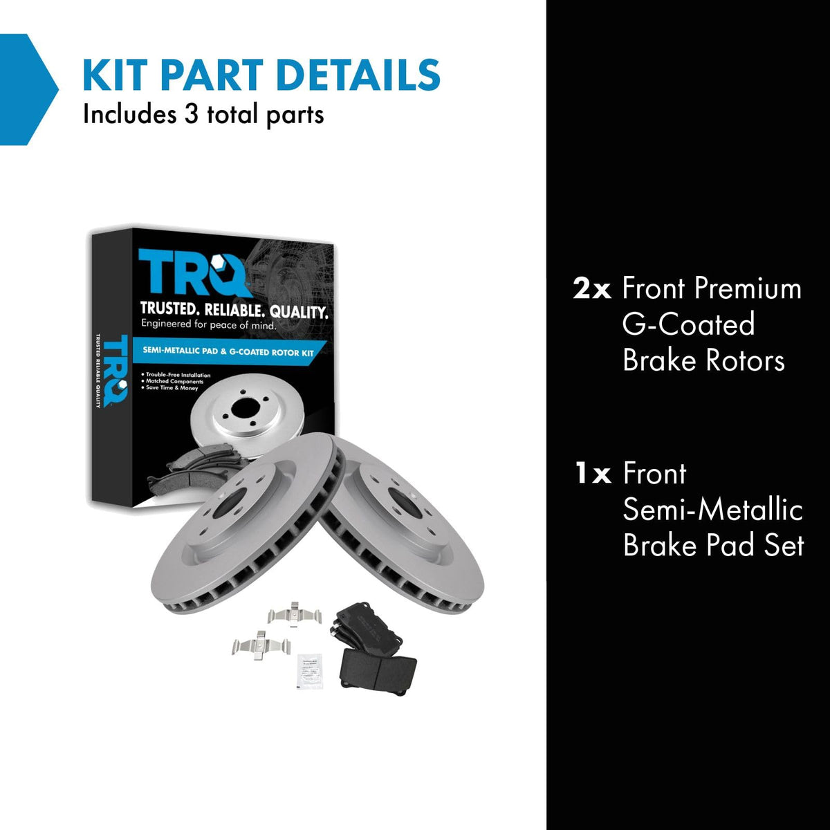 Semi-Metallic Brake Pad & Rotor KitKit Includes(1) Front Semi-Metallic Brake Pad Set(2) Front Premium G-Coated Brake RotorsFitmentCompatible with: 2012-13 Buick Regal GS with Brembo Calipers Front Semi-Metallic Premium G-Coated Brake Pad & Rotor KitCompatible with: 2009 Pontiac G8 GXP Front Semi-Metallic Premium G-Coated Brake Pad & Rotor KitProduct AttributesFront Brake Rotor Diameter: 13.98 in. (355mm)Wheel Lug Count: 5 LugBrake Rotor Coating: Premium G-CoatedBrake Pad Friction Material: Semi-MetallicFront Brake Rotor Venting Type: VentedProduct Features Positive Molded: Less dust resulting in clean wheels Electrostatic Coated: Long-lasting rust protection G3000 Casting Alloy: Reduced noise and improved wear resistance Application Specific Design: Extended service life, no modificationsItem DetailsTRQ brake kits are designed to restore your brake system to like-new performance. TRQ brake pads are positive molded, thermal scorched, chamfered, and utilize a multi-layer shim for enhanced performance and service life. TRQ G-coated rotors have long-lasting rust prevention, perfect for wheels with large openings that expose the rotor and rotor hat during daily drives. All products are fit and road-tested in our Massachusetts R&D facility to ensure we deliver on our promise of Trusted Reliable Quality.Reference NumbersBuick: 13329562Ford: DR3Z2001A, DR3Z2001CMitsubishi: 4605A572, MR407376Raybestos Brakes: EHT1001Subaru: 26296FE010, 26296FE041, 26296FE100, 26296FE120