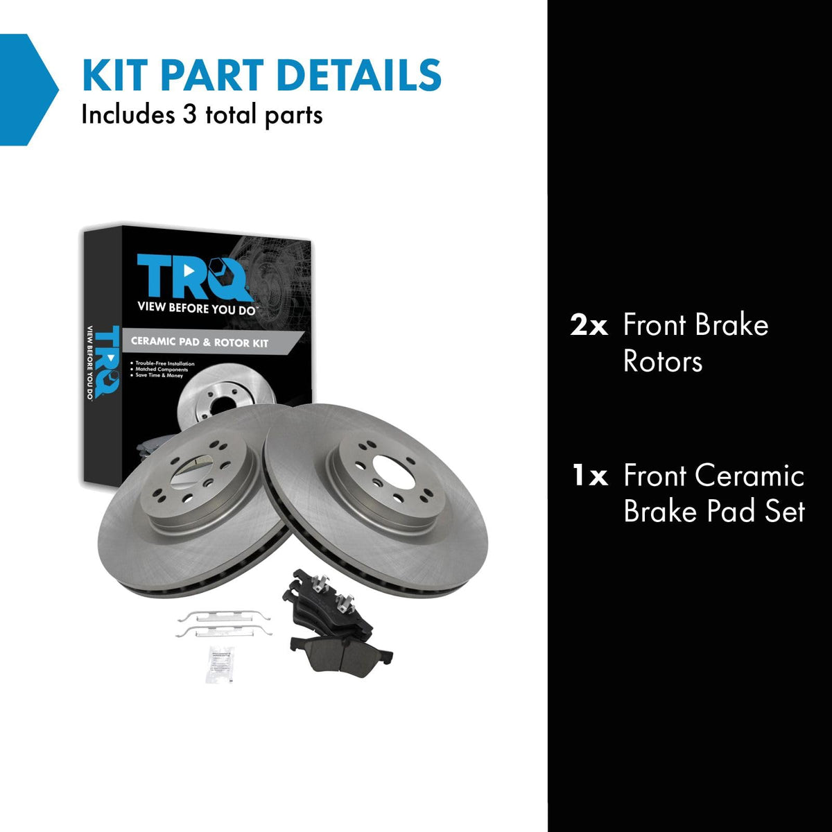 Ceramic Brake Pad & Rotor KitKit Includes(1) Front Ceramic Brake Pad Set(2) Front Brake RotorsFitmentCompatible with: 2006-11 Mercedes Benz ML350 Front with 13.78 in. 350mm Diameter Front RotorsCompatible with: 2007-12 Mercedes Benz GL450 FrontCompatible with: 2006-12 Mercedes Benz R350 Front with 13.78 in. 350mm Diameter Front Rotors with 3rd Row SeatingCompatible with: 2008-12 Mercedes Benz GL550 FrontCompatible with: 2007-09 Mercedes Benz ML320 Front with 13.78 in. 350mm Diameter Front RotorsCompatible with: 2008-11 Mercedes Benz ML550 Front with 13.78 in. 350mm Diameter Front RotorsCompatible with: 2010-12 Mercedes Benz GL350 FrontCompatible with: 2007-08 Mercedes Benz GL320 Front with 13.78 in. 350mm Diameter Front Rotors with 18 Inch WheelsCompatible with: 2006-07 Mercedes Benz R500 Front with 13.78 in. 350mm Diameter Front RotorsCompatible with: 2007-09 Mercedes Benz R320 Front with 13.78 in. 350mm Diameter Front RotorsCompatible with: 2010-11 Mercedes Benz ML450 FrontProduct AttributesBrake Pad Friction Material: CeramicBrake Pad Bonding Type: Premium PosiProduct Features Positive Molded - Less dust resulting in clean wheels G3000 Casting Alloy - Reduced noise and improved wear resistance Application Specific Design - Extended service life, no modificationsItem DetailsTRQ brake kits are designed to restore your brake system to like-new performance. TRQ brake pads are positive molded, thermal scorched, chamfered, and utilize a multi-layer shim for enhanced performance and service life. TRQ rotors have a non-directional finish that reduces the break-in period for new rotors as well as reducing vibrations throughout the rotors lifecycle. All products are fit and road-tested in our Massachusetts R&D facility to ensure we deliver on our promise of Trusted Reliable Quality.Reference NumbersAimco: 34297Bendix: PRT5871DuraGo: BR900874Hollander: 530-50104, 530-50317Mercedes-Benz: 1644200820, 1644201820, 44204020Raybestos Brakes: 980426, 980426FZN, 980426P, 980426R, PGD1123MWagner: BD180146