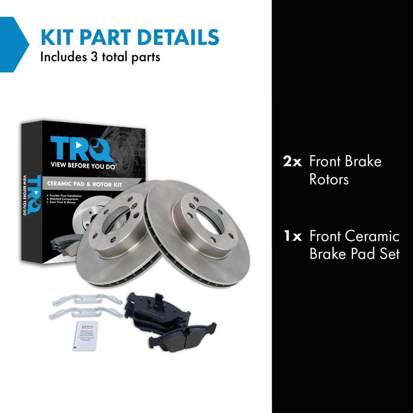 Ceramic Brake Pad & Rotor KitKit Includes(1) Front Ceramic Brake Pad Set(2) Front Brake RotorsFitmentCompatible with: 1999-00 BMW Z3 Roadster L6 2.5L FrontCompatible with: 1999-00 BMW Z3 Coupe L6 2.8L FrontCompatible with: 1998-00 BMW 323i FrontCompatible with: 1998 BMW Z3 L6 2.8L FrontCompatible with: 2000 BMW 323Ci Front with 11.26 in. 286mm Diameter Front RotorsCompatible with: 1998 BMW 328i FrontProduct AttributesBrake Pad Friction Material: CeramicBrake Pad Bonding Type: Premium PosiProduct Features Positive Molded - Less dust resulting in clean wheels G3000 Casting Alloy - Reduced noise and improved wear resistance Application Specific Design - Extended service life, no modificationsItem DetailsTRQ brake kits are designed to restore your brake system to like-new performance. TRQ brake pads are positive molded, thermal scorched, chamfered, and utilize a multi-layer shim for enhanced performance and service life. TRQ rotors have a non-directional finish that reduces the break-in period for new rotors as well as reducing vibrations throughout the rotors lifecycle. All products are fit and road-tested in our Massachusetts R&D facility to ensure we deliver on our promise of Trusted Reliable Quality.Reference NumbersAimco: 34064Bendix: PRT1815BMW: 34111164498, 34111164500, 34116756128, 34116761244DuraGo: BR34064Raybestos Brakes: 96393, 96393FZN, 96393P, 96393R, 96780, 96780FZN, 96780P, 96780R, EHT781Wagner: BD125277, BD180022