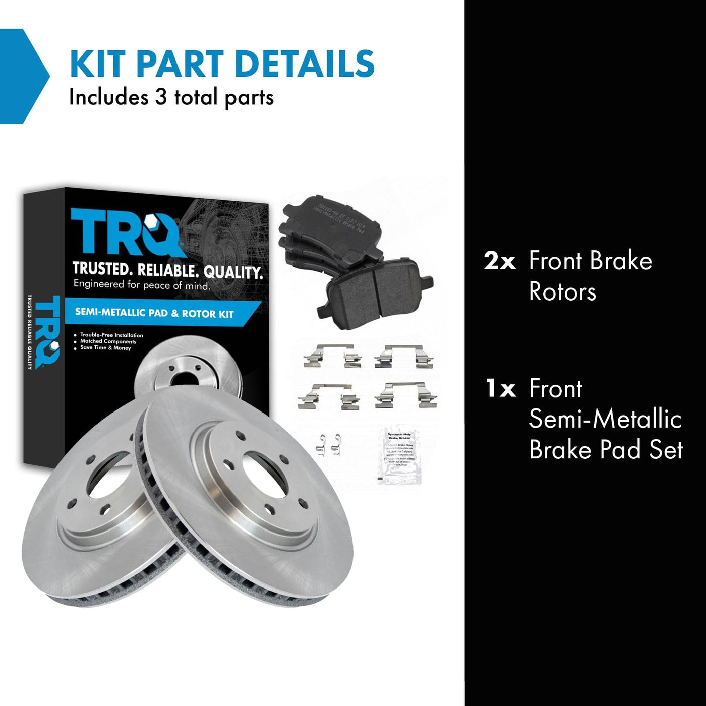 Semi-Metallic Brake Pad & Rotor KitKit Includes(1) Front Semi-Metallic Brake Pad Set(2) Front Brake RotorsFitmentCompatible with: 2009-12 Chevrolet Malibu FrontCompatible with: 2005-07 Chevrolet Cobalt Front with Rear Disc BrakesCompatible with: 2008-10 Pontiac G6 FrontCompatible with: 2008-10 Chevrolet HHR SS Front with Single Piston Front CalipersCompatible with: 2006-07 Pontiac G6 Front with 296 mm Diameter Front Rotors with 4 Wheel ABS BrakesCompatible with: 2006-07 Chevrolet Malibu Front with 296 mm Diameter Front Rotors with Rear Disc BrakesCompatible with: 2004-05 Chevrolet Malibu Front with 296 mm Diameter Front Rotors with 4 Wheel ABS BrakesCompatible with: 2005-07 Saturn Ion Red Line FrontCompatible with: 2008 Chevrolet Malibu Classic LT Front with 296 mm Diameter Front RotorsCompatible with: 2008 Chevrolet Malibu Hybrid FrontCompatible with: 2008 Chevrolet Malibu Classic LS Front with 296 mm Diameter Front RotorsCompatible with: 2008 Chevrolet Malibu LT FrontCompatible with: 2008 Chevrolet Malibu LTZ FrontCompatible with: 2008 Chevrolet Malibu LS FrontCompatible with: 2007-09 Saturn Aura FrontCompatible with: 2007-08 Pontiac G5 Front with 5 Lug Wheels with Rear Disc BrakesCompatible with: 2005 Pontiac G6 FrontProduct AttributesFront Brake Rotor Diameter: 11.65 in. (296mm)Wheel Lug Count: 5 LugBrake Pad Bonding Type: Premium PosiBrake Pad Friction Material: Semi-MetallicFront Brake Rotor Venting Type: VentedProduct Features Positive Molded - Less dust resulting in clean wheels G3000 Casting Alloy - Reduced noise and improved wear resistance Application Specific Design - Extended service life, no modificationsItem DetailsTRQ brake kits are designed to restore your brake system to like-new performance. TRQ brake pads are positive molded, thermal scorched, chamfered, and utilize a multi-layer shim for enhanced performance and service life. TRQ rotors have a non-directional finish that reduces the break-in period for new rotors as well as reducing vibrations throughout the rotors lifecycle. All products are fit and road-tested in our Massachusetts R&D facility to ensure we deliver on our promise of Trusted Reliable Quality.Reference NumbersAimco: 55093Bendix: PRT5528Chevrolet: 15243704, 15808204, 20881786, 22820406, 25809846, 25957440DuraGo: BR55093Pontiac: 15808204, 20881786, 25809846, 25957440Raybestos Brakes: 580184, 580184FZN, 580184P, 580184R, EHT1160HSaturn: 15808204Wagner: BD126138, BD126578, BD126581