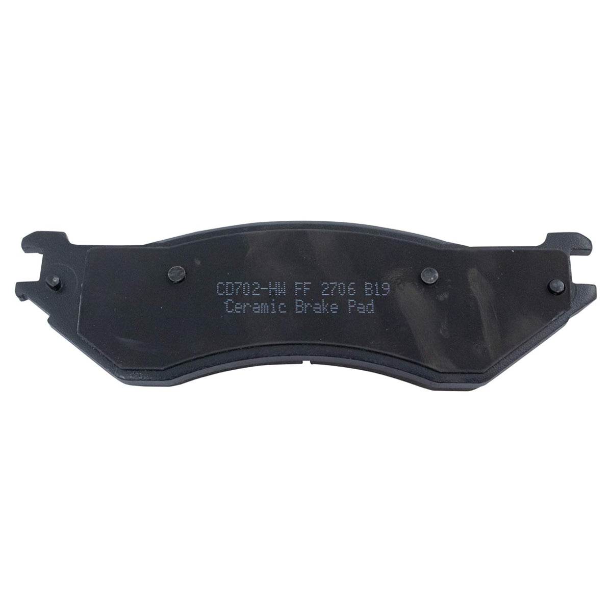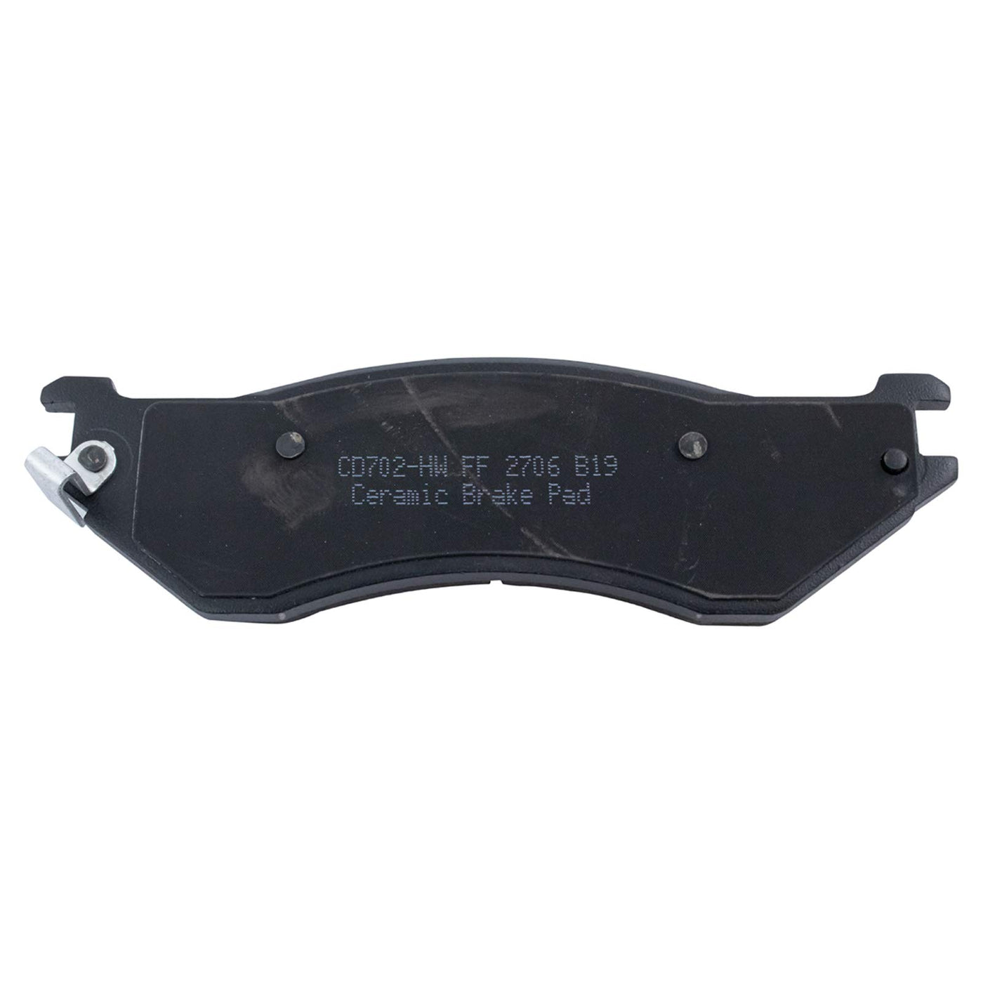 Ceramic Brake PadsFitmentCompatible with: 1999-03 Ford F150 Truck Lightning FrontCompatible with: 1999-03 Ford F150 Truck XL with 7 Lug Wheels FrontCompatible with: 1999-03 Ford F150 Truck XLT with 7 Lug Wheels FrontCompatible with: 1999-03 Ford F150 Truck Lariat with 7 Lug Wheels FrontCompatible with: 2001-03 Ford F150 Truck King Ranch with 7 Lug Wheels FrontCompatible with: 2002-03 Ford F150 Truck Harley-Davidson Edition FrontCompatible with: 2000-01 Ford F150 Truck Harley-Davidson Edition with 7 Lug Wheels FrontCompatible with: 1999-00 Ford F150 Truck Base Model with 7 Lug Wheels FrontCompatible with: 1997-02 Ford Expedition FrontCompatible with: 2000-01 Dodge Ram 1500 Truck FrontCompatible with: 2004 Ford F150 Heritage Truck with 7 Lug Wheels FrontCompatible with: 1998-02 Lincoln Navigator FrontCompatible with: 1997-99 Ford F250 Truck FrontCompatible with: 1998 Dodge B1500 FrontProduct AttributesInner Pad Friction Material Thickness: 0.39 inOuter Pad Friction Material Thickness: 0.39 inOuter Pad Overall Thickness: 0.63 inInner Pad Overall Thickness: 0.63 inInner Pad Friction Material Thickness: 10 mmOuter Pad Friction Material Thickness: 10 mmOuter Pad Overall Thickness: 16 mmInner Pad Overall Thickness: 16 mmOuter Pad Width: 189 mmInner Pad Width: 189 mmOuter Pad Height: 2.20 inInner Pad Height: 2.20 inPad Quantity: 4Outer Pad Height: 56 mmInner Pad Height: 56 mmOuter Pad Width: 7.44 inInner Pad Width: 7.44 inBacking Plate Color: BlackPad Shim Color: BlackFriction Material Composition: CeramicPad Shim Material: FiberFriction Material Attachment: Integrally MoldedPad Wear Sensor Type: MechanicalBetter Brakes Law SAE Environmental Compliance Level: NBolts Included: NoAbutment Clips Included: NoBacking Material: SteelWear Indicator Attached: YesPad Shims Included: YesPad Wear Sensor Included: YesChamfered Edges: YesPrepared For Pad Wear Sensor: YesMounting Hardware Included: YesSlotted: YesFriction Surface Scorched: YesBrake Lubricant Included: YesBrake Pad Friction Material: CeramicIncludes: Contact Point GreaseIncludes: HardwareBrake Pad Bonding Type: Premium PosiProduct Features Positive Molded: Less dust resulting in clean wheels Thermal Scorched: Improved stopping performance Application Specific Design: Extended service life, no modifications Hardware and grease included for a complete repair Environmentally Compliant: Meets all Better Brake Law standardsItem DetailsTRQ brake pads are manufactured using premium raw materials and design standards to restore original performance. TRQ brake pads are positive molded and utilize a multi-layer shim for enhanced performance and service life. TRQs combination of materials and design ensures a low dust and low noise braking experience. TRQ recommends replacing your brake rotors when you replace your brake pads to ensure even wear of components and improved braking comfort. All products are fit and road-tested in our Massachusetts R&D facility to ensure we deliver on our promise of Trusted Reliable Quality.Reference NumbersFord: F75Z2001AALincoln: F75Z2001AARaybestos Brakes: EHT702H, MGD702CH