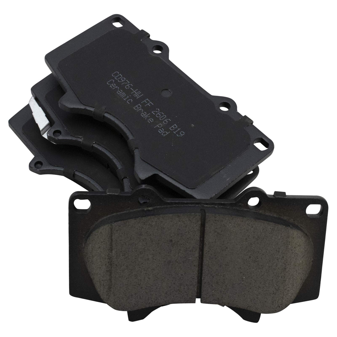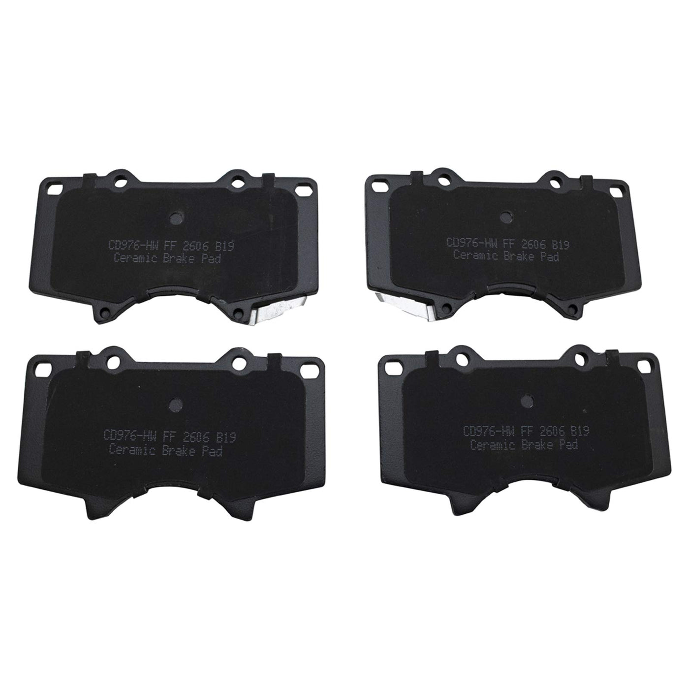 Ceramic Brake PadsFitmentCompatible with: 2003-22 Toyota 4Runner FrontCompatible with: 2016-22 Toyota Tacoma FrontCompatible with: 2005-15 Toyota Tacoma Rear Wheel Drive with 6 Lug Wheels FrontCompatible with: 2005-15 Toyota Tacoma 4 Wheel Drive FrontCompatible with: 2000-03 Toyota Tundra with Caliper Casting #13WL FrontCompatible with: 2004-06 Toyota Tundra FrontCompatible with: 2010-22 Lexus GX460 FrontCompatible with: 2007-14 Toyota FJ Cruiser FrontCompatible with: 2004-07 Toyota Sequoia FrontCompatible with: 2001-03 Toyota Sequoia with Caliper Casting #13WL FrontCompatible with: 2003-09 Lexus GX470 FrontProduct AttributesInner Pad Friction Material Thickness: 0.47 inOuter Pad Friction Material Thickness: 0.47 inInner Pad Overall Thickness: 0.67 inOuter Pad Overall Thickness: 0.67 inInner Pad Friction Material Thickness: 12 mmOuter Pad Friction Material Thickness: 12 mmInner Pad Width: 134 mmOuter Pad Width: 134 mmOuter Pad Overall Thickness: 17 mmInner Pad Overall Thickness: 17 mmInner Pad Height: 3.03 inOuter Pad Height: 3.03 inPad Quantity: 4Inner Pad Width: 5.28 inOuter Pad Width: 5.28 inOuter Pad Height: 77 mmInner Pad Height: 77 mmFriction Material Attachment: BondedFriction Material Composition: CeramicPad Wear Sensor Type: MechanicalGrade Type: RegularPad Shims Included: YesAbutment Clips Included: YesFriction Surface Scorched: YesPad Wear Sensor Included: YesBrake Lubricant Included: YesBrake Pad Friction Material: CeramicIncludes: Contact Point GreaseIncludes: HardwareBrake Pad Bonding Type: Premium PosiProduct Features Positive Molded: Less dust resulting in clean wheels Thermal Scorched: Improved stopping performance Application Specific Design: Extended service life, no modifications Hardware and grease included for a complete repair Environmentally Compliant: Meets all Better Brake Law standardsItem DetailsTRQ brake pads are manufactured using premium raw materials and design standards to restore original performance. TRQ brake pads are positive molded and utilize a multi-layer shim for enhanced performance and service life. TRQs combination of materials and design ensures a low dust and low noise braking experience. TRQ recommends replacing your brake rotors when you replace your brake pads to ensure even wear of components and improved braking comfort. All products are fit and road-tested in our Massachusetts R&D facility to ensure we deliver on our promise of Trusted Reliable Quality.Reference NumbersLexus: 446535250, 446535290, 446560320Mitsubishi: 4605A481Raybestos Brakes: EHT976H, MGD976CH, SGD976CToyota: 044650K280, 044650K390, 446504070, 446504090, 446535290, 446560320