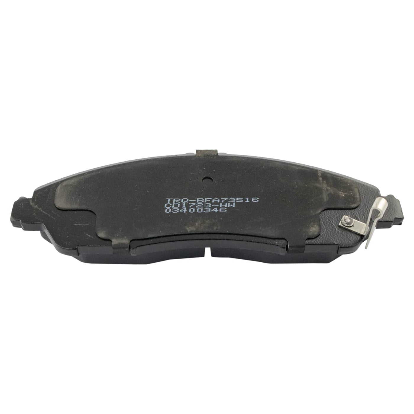 Ceramic Brake PadsFitmentCompatible with: 2016-22 Honda Pilot FrontCompatible with: 2014-20 Acura MDX FrontCompatible with: 2017-21 Honda Ridgeline FrontProduct AttributesInner Pad Friction Material Thickness: 0.63 inOuter Pad Friction Material Thickness: 0.63 inOuter Pad Overall Thickness: 0.67 inInner Pad Overall Thickness: 0.67 inOuter Pad Friction Material Thickness: 16 mmInner Pad Friction Material Thickness: 16 mmOuter Pad Overall Thickness: 17 mmInner Pad Overall Thickness: 17 mmOuter Pad Height: 170 mmInner Pad Height: 170 mmOuter Pad Width: 2.28 inInner Pad Width: 2.28 inPad Quantity: 4Outer Pad Width: 58 mmInner Pad Width: 58 mmOuter Pad Height: 6.69 inInner Pad Height: 6.69 inBacking Plate Color: BlackPad Shim Color: BlackFriction Material Attachment: BondedFriction Material Composition: CeramicPad Wear Sensor Type: MechanicalBetter Brakes Law SAE Environmental Compliance Level: NMounting Hardware Included: NoFriction Surface Scorched: NoBolts Included: NoECE-R90 Certified: NoPad Shim Material: R-S-RGrade Type: RegularBacking Material: SteelSlotted: YesBrake Lubricant Included: YesAbutment Clips Included: YesChamfered Edges: YesPrepared For Pad Wear Sensor: YesPad Shims Included: YesPad Wear Sensor Included: YesWear Indicator Attached: YesBrake Pad Friction Material: CeramicIncludes: Contact Point GreaseIncludes: HardwareBrake Pad Bonding Type: Premium PosiProduct Features Positive Molded: Less dust resulting in clean wheels Thermal Scorched: Improved stopping performance Application Specific Design: Extended service life, no modifications Hardware and grease included for a complete repair Environmentally Compliant: Meets all Better Brake Law standardsItem DetailsTRQ brake pads are manufactured using premium raw materials and design standards to restore original performance. TRQ brake pads are positive molded and utilize a multi-layer shim for enhanced performance and service life. TRQs combination of materials and design ensures a low dust and low noise braking experience. TRQ recommends replacing your brake rotors when you replace your brake pads to ensure even wear of components and improved braking comfort. All products are fit and road-tested in our Massachusetts R&D facility to ensure we deliver on our promise of Trusted Reliable Quality.Reference NumbersAcura: 45022TZ5A00, 45022TZ5A01, 45022TZ5A10Honda: 45022TZ5A01Raybestos Brakes: EHT1723H, MGD1723CH