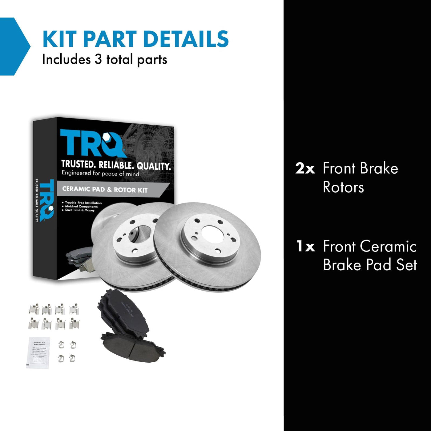 Ceramic Brake Pad & Rotor KitKit Includes(1) Front Ceramic Brake Pad Set(2) Front Brake RotorsFitmentCompatible with: 2013-18 Toyota Rav4 XLE Japan Built Models 1st VIN Digit J FrontCompatible with: 2013-18 Toyota Rav4 Limited FrontCompatible with: 2013-18 Toyota Rav4 Limited Japan Built Models 1st VIN Digit J FrontCompatible with: 2013-18 Toyota Rav4 XLE FrontCompatible with: 2006-11 Toyota Rav4 Front with 3rd Row SeatingCompatible with: 2009-11 Toyota Rav4 Japan Built Models 1st VIN Digit J Front with 3rd Row SeatingCompatible with: 2012 Toyota Rav4 Sport Japan Built Models 1st VIN Digit J Front with 3rd Row SeatingCompatible with: 2012 Toyota Rav4 Base Model Front with 3rd Row SeatingCompatible with: 2012 Toyota Rav4 Base Model Japan Built Models 1st VIN Digit J Front with 3rd Row SeatingCompatible with: 2012 Toyota Rav4 Sport Front with 3rd Row SeatingCompatible with: 2012 Toyota Rav4 Limited Japan Built Models 1st VIN Digit J Front with 3rd Row SeatingCompatible with: 2012 Toyota Rav4 Limited Front with 3rd Row SeatingCompatible with: 2011-16 Scion tC FrontCompatible with: 2009-13 Toyota Matrix S FrontCompatible with: 2009-10 Toyota Matrix XRS FrontCompatible with: 2009-10 Pontiac Vibe L4 2.4L FrontCompatible with: 2017-18 Toyota Corolla iM FrontCompatible with: 2016 Scion iM FrontCompatible with: 2016-19 Toyota Mirai FrontProduct AttributesFront Brake Rotor Diameter: 11.65 in. (296mm)Wheel Lug Count: 5 LugBrake Pad Friction Material: CeramicBrake Pad Bonding Type: Premium PosiFront Brake Rotor Venting Type: VentedProduct Features Positive Molded - Less dust resulting in clean wheels G3000 Casting Alloy - Reduced noise and improved wear resistance Application Specific Design - Extended service life, no modificationsItem DetailsTRQ brake kits are designed to restore your brake system to like-new performance. TRQ brake pads are positive molded, thermal scorched, chamfered, and utilize a multi-layer shim for enhanced performance and service life. TRQ rotors have a non-directional finish that reduces the break-in period for new rotors as well as reducing vibrations throughout the rotors lifecycle. All products are fit and road-tested in our Massachusetts R&D facility to ensure we deliver on our promise of Trusted Reliable Quality.Reference NumbersAdvance Auto Parts: 40551128501, N1000301784BRC, YH145713C, YH145713PAimco: 31434Autoxtra: AX900340AutoZone: 44582, 44582DG, 44582DL, DL44582Bendix: PRT5713, PRT6155Bosch: 50011459, 50011486BrakeBest: 50011459, 50011486, 980470, 980470FZN, 980470R, 980470RGSCasting Numbers: 326282Centric Parts: 120.44146, 120.44146CRY, 121.44146, 126.44146CSL, 126.44146CSR, 126.44146SL, 126.44146SR, 127.44146CL, 127.44146CR, 127.44146L, 127.44146R, 128.44146CL, 128.44146CR, 128.44146L, 128.44146R, 227.44146L, 227.44146R, 320.44146, 321.44146Dura Corp: BR31434, BR900340, BR90034002DuraGo: 900340, BR900340, BR90034002Dynamic Friction Company: 604-76080General Motors: 19184294, 19205637Monroe Brakes: BD126407NAPA BRAKES: SDK6253Newtek Automotive USA: 31434Omnicraft: QBRR155, QBRR611Parts Master: 900340Pontiac: 19184911PowerStop: JBR1127EVCPromax: 14-31434, 20-31434Qualis: 44582Raybestos Brakes: 980470, 980470FZN, 980470P, 980470R, 980781, 980781FZN, 980781P, 980781R, 980973, 980973FZN, 980973P, 980973R, EHT1211H, MGD1211CHScion: 446542180Toyota: 4351202250, 4351206090, 4351233130, 4351242050, 446502230, 446542150, 446542180TruStar: 479615TRW: 4828UAP: 31434Ultra Brake: TO-6000WABCO - Archived: PS900340Wagner Brake: 31434, BD126407, BD126407EWagner: BD126407Winhere: 6621436