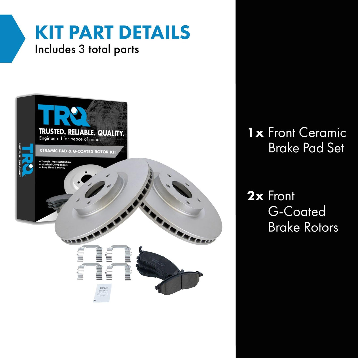 Ceramic Brake Pad & Rotor KitKit Includes(1) Front Ceramic Brake Pad Set(2) Front G-Coated Brake RotorsFitmentCompatible with: 2011-12 Nissan Murano CrossCabriolet Front Ceramic Premium G-Coated Brake Pad & Rotor KitCompatible with: 2013-14 Nissan Murano Front Ceramic Premium G-Coated Brake Pad & Rotor KitCompatible with: 2012-19 Nissan 370Z Front Ceramic Premium G-Coated Brake Pad & Rotor KitCompatible with: 2008-12 Infiniti EX35 Front Ceramic Premium G-Coated Brake Pad & Rotor KitCompatible with: 2009-11 Nissan 370Z Front Ceramic Premium G-Coated Brake Pad & Rotor KitCompatible with: 2011-12 Infiniti M37 Base Model Front without Sport Package Ceramic Premium G-Coated Brake Pad & Rotor KitCompatible with: 2011-12 Infiniti M37 X Front Ceramic Premium G-Coated Brake Pad & Rotor KitCompatible with: 2015-19 Nissan 370Z Touring Front Ceramic Premium G-Coated Brake Pad & Rotor KitCompatible with: 2015-19 Nissan 370Z Base Model Front Ceramic Premium G-Coated Brake Pad & Rotor KitCompatible with: 2015-17 Infiniti QX70 Front Ceramic Premium G-Coated Brake Pad & Rotor KitCompatible with: 2012-14 Nissan 370Z Base Model Front without Sport Package Ceramic Premium G-Coated Brake Pad & Rotor KitCompatible with: 2012-14 Nissan 370Z Touring Front without Sport Package Ceramic Premium G-Coated Brake Pad & Rotor KitCompatible with: 2011-12 Infiniti G25 Front Ceramic Premium G-Coated Brake Pad & Rotor KitCompatible with: 2014-18 Infiniti Q70 Hybrid Front without Sport Package Ceramic Premium G-Coated Brake Pad & Rotor KitCompatible with: 2015-19 Infiniti Q70L Front with 12.6 in. 320mm Diameter Front Rotors without Sport Package Ceramic Premium G-Coated Brake Pad & Rotor KitCompatible with: 2015-17 Infiniti Q70 5.6 Front with 12.6 in. 320mm Diameter Front Rotors without Sport Package Ceramic Premium G-Coated Brake Pad & Rotor KitCompatible with: 2015-17 Infiniti Q70 3.7 Front with 12.6 in. 320mm Diameter Front Rotors without Sport Package Ceramic Premium G-Coated Brake Pad & Rotor KitCompatible with: 2015 Infiniti Q40 Front Ceramic Premium G-Coated Brake Pad & Rotor KitCompatible with: 2013 Infiniti M37 Front without Sport Package Ceramic Premium G-Coated Brake Pad & Rotor KitCompatible with: 2014-15 Infiniti QX50 Front Ceramic Premium G-Coated Brake Pad & Rotor KitCompatible with: 2014 Infiniti QX70 V6 3.7L From 9/01/13 Production Date Front Ceramic Premium G-Coated Brake Pad & Rotor KitCompatible with: 2018-19 Infiniti Q70 5.6 Luxe Front with 12.6 in. 320mm Diameter Front Rotors without Sport Package Ceramic Premium G-Coated Brake Pad & Rotor KitCompatible with: 2018-19 Infiniti Q70 Luxe Front with 12.6 in. 320mm Diameter Front Rotors Ceramic Premium G-Coated Brake Pad & Rotor KitCompatible with: 2013 Infiniti EX37 Front Ceramic Premium G-Coated Brake Pad & Rotor KitCompatible with: 2014 Infiniti Q70 5.6 Front with 12.6 in. 320mm Diameter Front Rotors without Sport Package Ceramic Premium G-Coated Brake Pad & Rotor KitCompatible with: 2014 Infiniti Q70 3.7 Front with 12.6 in. 320mm Diameter Front Rotors without Sport Package Ceramic Premium G-Coated Brake Pad & Rotor KitCompatible with: 2012-13 Infiniti M35h Front Ceramic Premium G-Coated Brake Pad & Rotor KitProduct AttributesFront Brake Rotor Diameter: 12.59 in. (319.7mm)Wheel Lug Count: 5 LugBrake Pad Friction Material: CeramicBrake Rotor Coating: Premium G-CoatedBrake Pad Bonding Type: Premium PosiBrake Rotor Venting Type: VentedProduct Features Positive Molded: Less dust resulting in clean wheels Electrostatic Coated: Long-lasting rust protection G3000 Casting Alloy: Reduced noise and improved wear resistance Application Specific Design: Extended service life, no modificationsItem DetailsTRQ brake kits are designed to restore your brake system to like-new performance. TRQ brake pads are positive molded, thermal scorched, chamfered, and utilize a multi-layer shim for enhanced performance and service life. TRQ G-coated rotors have long-lasting rust prevention, perfect for wheels with large openings that expose the rotor and rotor hat during daily drives. All products are fit and road-tested in our Massachusetts R&D facility to ensure we deliver on our promise of Trusted Reliable Quality.Reference NumbersINFINITI: 41060AR090, 41060AT30J, 41060EG090, D10601NC0A, D10601NC0B, D10601NC0C, D1060EG51A, D1060EJ20ANissan: 41060EG090, D10601NC0A, D10601NC0B, D10601NC0C, D1060EG51A, D1060EJ20A, D1060ZS60ARaybestos Brakes: EHT888H, MGD888CH, PGD888CRenault: 410600023R, 410603072R