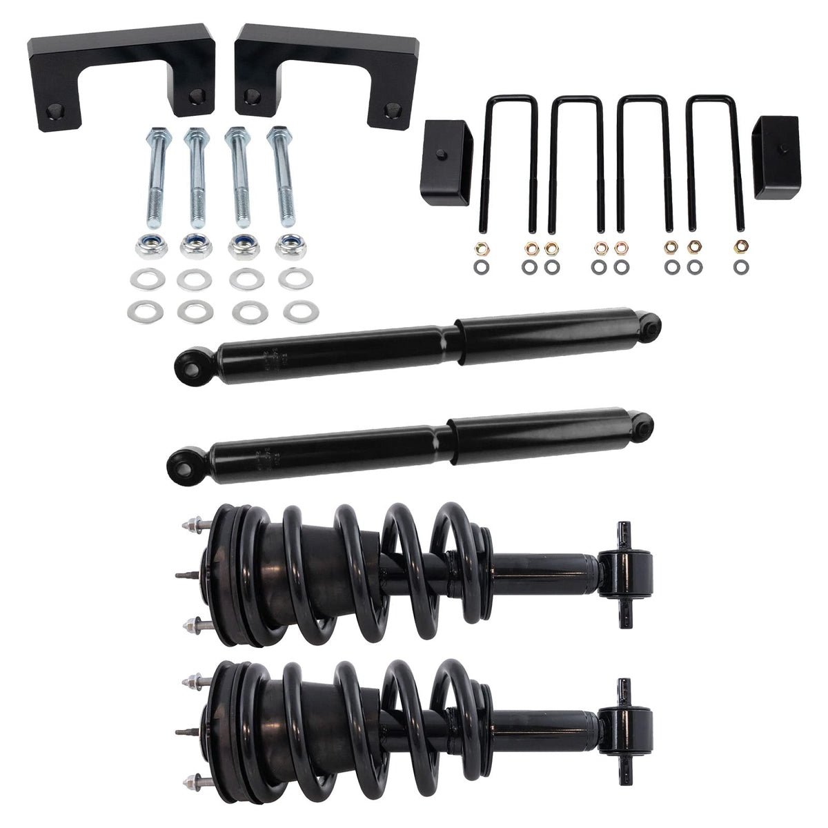 4 Piece Complete Strut Assembly & Shock Absorber Kitkit Includes(1) Front Leveling Kit(1) Rear Leveling Kit(2) Front Shock & Spring Assemblies(2) Rear Shock Absorbersfitmentcompatible With: 2014-16 Chevrolet Silverado 1500 4 Wheel Drive Front & Rear With Leveling Kitcompatible With: 2017-18 Chevrolet Silverado 1500 4 Wheel Drive Without Magnetic Ride Control Front & Rear With Leveling Kitcompatible With: 2014-18 Gmc Sierra 1500 4 Wheel Drive Without Electronic Suspension Without Magnetic Ride Control Front & Rear With Leveling Kitcompatible With: 2019 Chevrolet Silverado 1500 Legacy 4 Wheel Drive Without Magnetic Ride Control Front & Rear With Leveling Kitcompatible With: 2019 Gmc Sierra 1500 Limited 4 Wheel Drive Without Electronic Suspension Without Magnetic Ride Control Front & Rear With Leveling Kitproduct Attributesride Height Lower / Lift: 2 In. Liftquantity: 4 Pieceproduct Features Loaded Struts: Pre-Assembled Application Specific Design Application Specific Design: No Modifications Necessary Matched Pair: Improved Comfort And Extended Service Life Restored Performance: Reduced Body Sway And Vibrationitem Detailstrq Fully Loaded Shocks And Struts Are Manufactured Using Premium Raw Materials And Calibrated To Restore Original Ride Comfort. Trq Shocks Are Fully Loaded Featuring A Pre-Loaded Bearing Plate, Upper And Lower Spring Isolator, Upper Spring Seat, Coil Spring, Boot Kit, And Premium Strut. Trq Recommends Replacing Your Shocks Or Struts In Pairs To Ensure Even Wear Of Components And Improved Ride Comfort. All Products Are Fit And Road-Tested In Our Massachusetts R&D Facility To Ensure We Deliver On Our Promise Of Trusted Reliable Quality.Reference Numbersautopart International: 2701-424158, Kyb345074Freedom Off-Road: Fo-G302F20, Fo-U30120+Fo-G403Gabriel: 61690, G57000, G61959, G63959Kyb: 345074, 555055, 565128, Sr4547Monroe Shocks & Struts: 239112, 552001, 911533Motofab: Ch-2Lm, Ch-2Rosc: S345074Rancho: Rs55198Rough Country: 1307, 1313, 6532Sensen: 1214-0171Skyjacker: C1420Lmsasouthern Truck: 15001A, 15030Supreme Suspensions: A0510, A1135Unity Automotive: 11660, 2-251500-001, 251500, 411650251500-001, 411660251500-001Worldpac: L4000382376Kyb