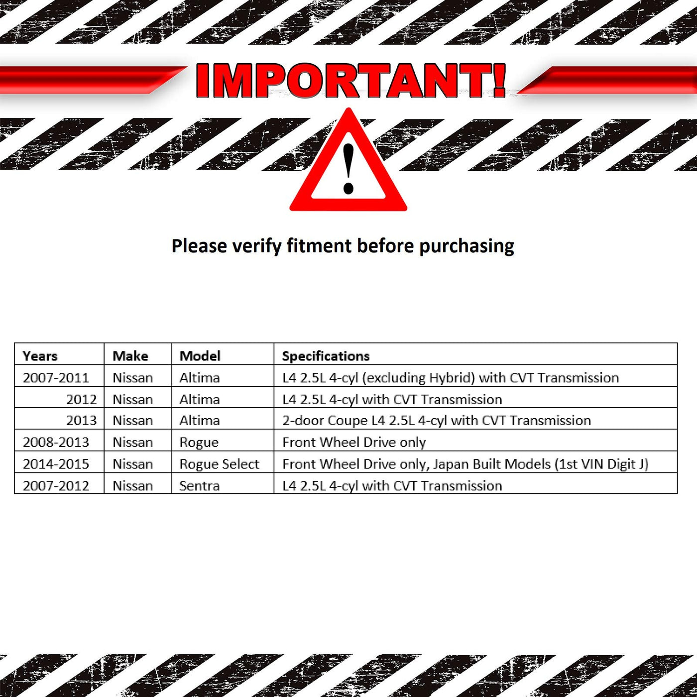 2 Piece Cv Axle Assembly Setkit Includes(1) Front Driver Side Cv Axle Assembly(1) Front Passenger Side Cv Axle Assemblyfitmentcompatible With: 2007-12 Nissan Altima Automatic Cvt Transmission Front Driver & Passenger Sidecompatible With: 2013 Nissan Altima Coupe L4 2.5L Front Driver & Passenger Sideproduct Attributesquantity: 2 Pieceitem Detailstrq Cv (Constant Velocity) Drive Axles Are Manufactured Using Premium Raw Materials Designed To Restore Original Performance. Trq Cv Drive Axles Are New, So There Is No Core Charge With Your Trq Purchase. Trq-Designed Drive Axles Utilize Neoprene Boots, Moly Grease, Stainless Steel Clamps, And Heat-Treated Ball Tracks To Ensure Extended Service Life. Each Trq Axle Is Application-Specific So Each Spline And Thread Will Mate Properly For A Seamless Fit. All Products Are Fit And Road-Tested In Our Massachusetts R&D Facility To Ensure We Deliver On Our Promise Of Trusted Reliable Quality.Reference Numbersapw: Ni8366Cardone New: 66-6262, 66-6264Cardone: 66-6264, 666262, 666264Datsun/Nissan: 39101Et80C, 39101Ja010, 39101Jg02Cdrive Tech America: Ni2164Gsp: Ncv53911, Ncv53912Hollander: 447-50479Lnissan: 17010543, 39100Ja010, 39100Jg02Codm: Ni-8-8615Oem Part Number: 39101Ja010Omniparts: 17010543Trakmotive: Ni-8233, Ni8227