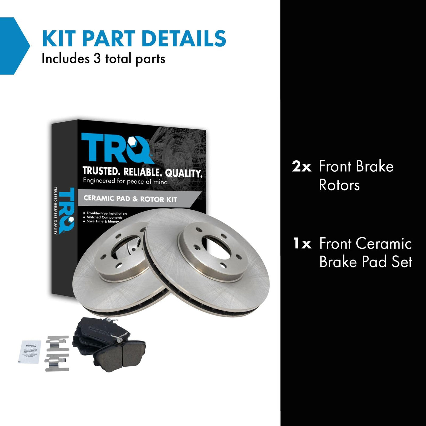 Ceramic Brake Pad & Rotor KitKit Includes(1) Front Ceramic Brake Pad Set(2) Front Brake RotorsFitmentCompatible with: 2001-07 Ford Taurus FrontCompatible with: 2001-05 Mercury Sable FrontCompatible with: 1996-99 Ford Taurus SHO FrontCompatible with: 1995-02 Lincoln Continental FrontCompatible with: 1996-97 Ford Thunderbird Front with Sport SuspensionCompatible with: 1996-98 Lincoln Mark VIII FrontCompatible with: 1996-97 Mercury Cougar Front with Sport SuspensionProduct AttributesFront Brake Rotor Diameter: 11.57 in. (294mm)Wheel Lug Count: 5 LugBrake Pad Friction Material: CeramicBrake Pad Bonding Type: Premium PosiFront Brake Rotor Venting Type: VentedProduct Features Positive Molded - Less dust resulting in clean wheels G3000 Casting Alloy - Reduced noise and improved wear resistance Application Specific Design - Extended service life, no modificationsItem DetailsTRQ brake kits are designed to restore your brake system to like-new performance. TRQ brake pads are positive molded, thermal scorched, chamfered, and utilize a multi-layer shim for enhanced performance and service life. TRQ rotors have a non-directional finish that reduces the break-in period for new rotors as well as reducing vibrations throughout the rotors lifecycle. All products are fit and road-tested in our Massachusetts R&D facility to ensure we deliver on our promise of Trusted Reliable Quality.Reference NumbersAimco: 54030Bendix: PRT5050DuraGo: BR54030Hollander: 530-01853Lincoln: F3LY2001A, F50Y2001A, XF3Z2001CBRaybestos Brakes: 66749, 66749FZN, 66749P, 66749R, EHT598H, MGD598CH, SGD598, SGD598CWagner: BD125532