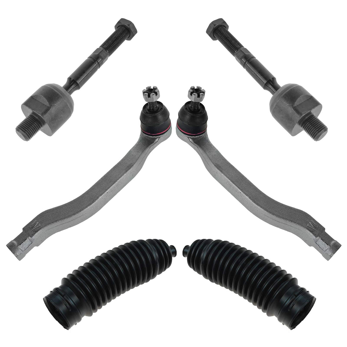 6 Piece Steering KitKit Includes(2) Front Inner Tie Rods(2) Front Outer Tie Rods(2) Front Steering Rack & Pinion BellowsFitmentCompatible with: 1999-03 Acura TL Front Driver & Passenger SideCompatible with: 2001-03 Acura CL Front Driver & Passenger SideProduct AttributesQuantity: 6 PieceProduct Features Application Specific Design: No modifications necessary Anti-Corrosion Coated: Enhanced surface life Pre-greased: No additional maintenance required Kitted for Restored Performance: Improved road-feel and handlingItem DetailsTRQ suspension kits are manufactured using premium raw materials and coatings for extended service life. Each TRQ suspension component is designed to be a direct, maintenance-free replacement to the stock unit. To extend the life of your steering and suspension components, TRQ recommends replacing components in pairs, sets, or kits. All products are fit and road-tested in our Massachusetts R&D facility to ensure we deliver on our promise of Trusted Reliable Quality.Reference NumbersBeck/Arnley: 103-2842DIY Solutions: SUS07431, SUS07432, SUS07433, SUS07794Dorman - OE Solutions: 535-145Dorman: 535-145EMPI: 88-1601-KMevotech: MES3490, MES3491, MEV415MOOG Chassis Products: ES3490, ES3491, EV415