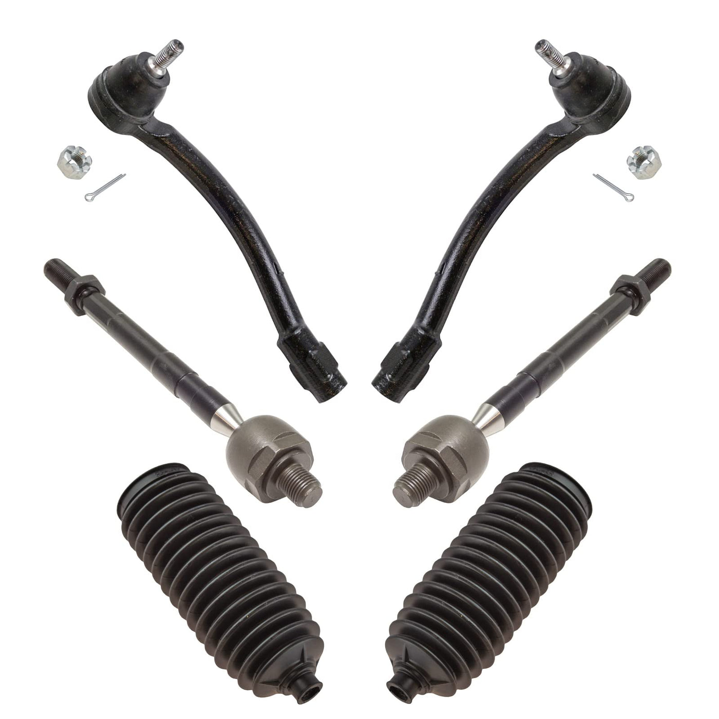 6 Piece Steering KitKit Includes(2) Front Inner Tie Rods(2) Front Outer Tie Rods(2) Front Steering Rack & Pinion BellowsFitmentCompatible with: 2013-16 Hyundai Elantra Front Driver & Passenger SideCompatible with: 2011-12 Hyundai Elantra GLS Front Driver & Passenger SideCompatible with: 2011-12 Hyundai Elantra Limited Front Driver & Passenger SideCompatible with: 2012-17 Hyundai Veloster Front Driver & Passenger SideCompatible with: 2014-16 Hyundai Elantra GT Front Driver & Passenger SideCompatible with: 2013-14 Hyundai Elantra Coupe Front Driver & Passenger SideProduct AttributesQuantity: 6 PieceProduct Features Application Specific Design: No modifications necessary Anti-Corrosion Coated: Enhanced surface life Pre-greased: No additional maintenance required Kitted for Restored Performance: Improved road-feel and handlingItem DetailsTRQ suspension kits are manufactured using premium raw materials and coatings for extended service life. Each TRQ suspension component is designed to be a direct, maintenance-free replacement to the stock unit. To extend the life of your steering and suspension components, TRQ recommends replacing components in pairs, sets, or kits. All products are fit and road-tested in our Massachusetts R&D facility to ensure we deliver on our promise of Trusted Reliable Quality.Reference NumbersDIY Solutions: SUS07234, SUS08148, SUS08149, SUS08150EMPI: 88-1645-KHyundai: 565403X000, 568203X000, 568203X090, 56820B2000, 56820B2050Kia: 56820B2000, 56820B2050Mevotech: MS90642, MS90643, MS90728MOOG Chassis Products: ES801074, ES801075, EV800886