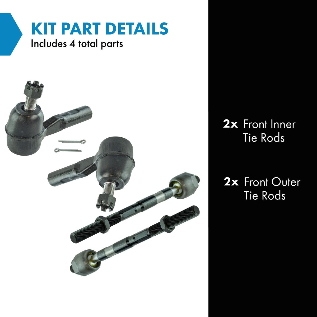 4 Piece Tie Rod SetKit Includes(2) Front Inner Tie Rods(2) Front Outer Tie RodsFitmentCompatible with: 2006-12 Chevrolet Colorado Rear Wheel Drive Front Driver & Passenger Side with 16mm Thread Tie Rods with Z71 Off Road Package Inner & OuterCompatible with: 2006-12 Chevrolet Colorado 4 Wheel Drive Front Driver & Passenger Side with 16mm Thread Tie Rods Inner & OuterCompatible with: 2006-12 GMC Canyon 4 Wheel Drive Front Driver & Passenger Side with 16mm Thread Tie Rods Inner & OuterCompatible with: 2006-12 GMC Canyon Rear Wheel Drive Front Driver & Passenger Side with 16mm Thread Tie Rods with Z71 Off Road Package Inner & OuterCompatible with: 2007-08 Isuzu i-370 Front with Front Torsion Bar Suspension Driver & Passenger Side with 16mm Thread Tie Rods Inner & OuterCompatible with: 2006 Isuzu i-350 Front with Front Torsion Bar Suspension Driver & Passenger Side with 16mm Thread Tie Rods Inner & OuterProduct AttributesQuantity: 4 PieceReference NumbersDIY Solutions: SUS03499, SUS08036, SUS08037Dorman - OE Solutions: 534-900Dorman: 534-900Mevotech: MES800464, MS50728MOOG Chassis Products: ES800464, EV800300