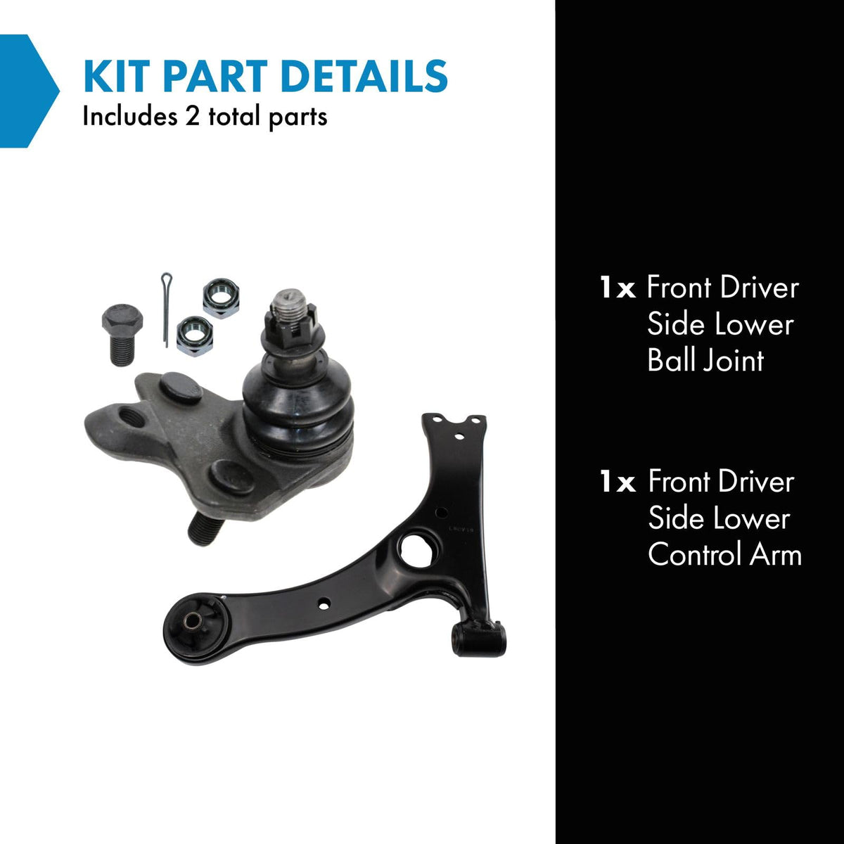 2 Piece Control Arm with Ball Joint SetKit Includes(1) Front Driver Side Lower Ball Joint(1) Front Driver Side Lower Control ArmFitmentCompatible with: 2005-10 Scion tC Front Driver Side LowerProduct AttributesQuantity: 2 PieceReference NumbersDIY Solutions: SUS00268Mevotech: CMS86126, GS86126, MK80595MOOG Chassis Products: K500040, K500175, RK640754QuickSteer: K80595Toyota: 48069-21020, 4806921020