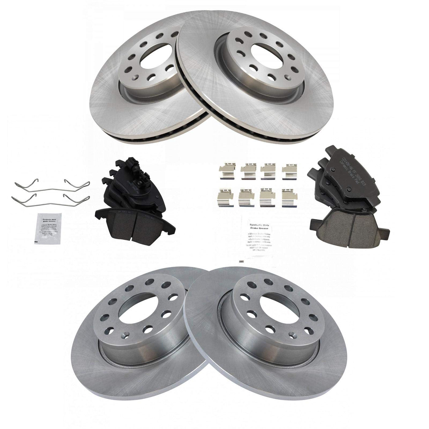 Ceramic Brake Pad & Rotor KitKit Includes(1) Front Ceramic Brake Pad Set(1) Rear Ceramic Brake Pad Set(2) Front Brake Rotors(2) Rear Brake RotorsFitmentCompatible with: 2010-12 VW Jetta TDI Front & Rear with 10.70 in. 272mm Diameter Rear Rotors with 12.28 in. 312mm Diameter Front RotorsCompatible with: 2013-14 VW Jetta TDI Wagon Front & Rear with 10.70 in. 272mm Diameter Rear Rotors with 12.28 in. 312mm Diameter Front RotorsCompatible with: 2013 VW Jetta GLI Sedan Front & Rear with 10.70 in. 272mm Diameter Rear Rotors with 12.28 in. 312mm Diameter Front RotorsCompatible with: 2012 VW Jetta TDI Premium Front & Rear with 10.70 in. 272mm Diameter Rear Rotors with 12.28 in. 312mm Diameter Front RotorsCompatible with: 2012 VW Jetta GLI Front & Rear with 10.70 in. 272mm Diameter Rear Rotors with 12.28 in. 312mm Diameter Front RotorsCompatible with: 2012-13 VW Beetle Turbo Front & Rear with 10.70 in. 272mm Diameter Rear RotorsCompatible with: 2010 VW Jetta Wolfsburg Edition Front & Rear with 10.70 in. 272mm Diameter Rear Rotors with 12.28 in. 312mm Diameter Front RotorsCompatible with: 2013 VW Beetle R-Line Front & Rear with 10.70 in. 272mm Diameter Rear RotorsCompatible with: 2012-14 VW GTI Front & Rear with 10.70 in. 272mm Diameter Rear Rotors with 12.28 in. 312mm Diameter Front RotorsCompatible with: 2009-16 VW Eos Front & Rear with 10.70 in. 272mm Diameter Rear RotorsCompatible with: 2011-13 Audi A3 Base Model Front & Rear with 10.70 in. 272mm Diameter Rear Rotors with 12.28 in. 312mm Diameter Front RotorsCompatible with: 2014 VW Golf Front & Rear with 10.70 in. 272mm Diameter Rear Rotors with 12.28 in. 312mm Diameter Front RotorsCompatible with: 2009-13 Audi A3 Quattro Front & Rear with 10.70 in. 272mm Diameter Rear RotorsCompatible with: 2010 Audi A3 Front & Rear with 10.70 in. 272mm Diameter Rear Rotors with 12.28 in. 312mm Diameter Front RotorsProduct AttributesRear Brake Rotor Diameter: 10.71 in. (272mm)Front Brake Rotor Diameter: 12.28 in. (312mm)Wheel Lug Count: 5 LugBrake Pad Friction Material: CeramicRear Brake Rotor Venting Type: SolidFront Brake Rotor Venting Type: VentedProduct Features Positive Molded - Less dust resulting in clean wheels G3000 Casting Alloy - Reduced noise and improved wear resistance Application Specific Design - Extended service life, no modificationsItem DetailsTRQ brake kits are designed to restore your brake system to like-new performance. TRQ brake pads are positive molded, thermal scorched, chamfered, and utilize a multi-layer shim for enhanced performance and service life. TRQ rotors have a non-directional finish that reduces the break-in period for new rotors as well as reducing vibrations throughout the rotors lifecycle. All products are fit and road-tested in our Massachusetts R&D facility to ensure we deliver on our promise of Trusted Reliable Quality.Reference NumbersAimco: 34279, 34431Audi: 1K0698151E, 3C0698151A, 5K0698151, 5K0698451Bendix: PRT5639, PRT6086DuraGo: BR900468, BR900930Hollander: 530-50102, 533-50274Peugeot: 425260Raybestos Brakes: 980383, 980383FZN, 980383P, 980383R, 980798, 980798FZN, 980798P, 980798R, EHT1107H, EHT1456H, MGD1107CH, MGD1456CHVolkswagen: 1K0615601AA, 1KO615601AA, 2K5698451, 3C0698151A, 561615601, 561615601A, 5C0698151A, 5K0698151, 5K0698451, 5K0698451A, 5Q0615601D, 5QM615601CWagner: BD126476, BD180424