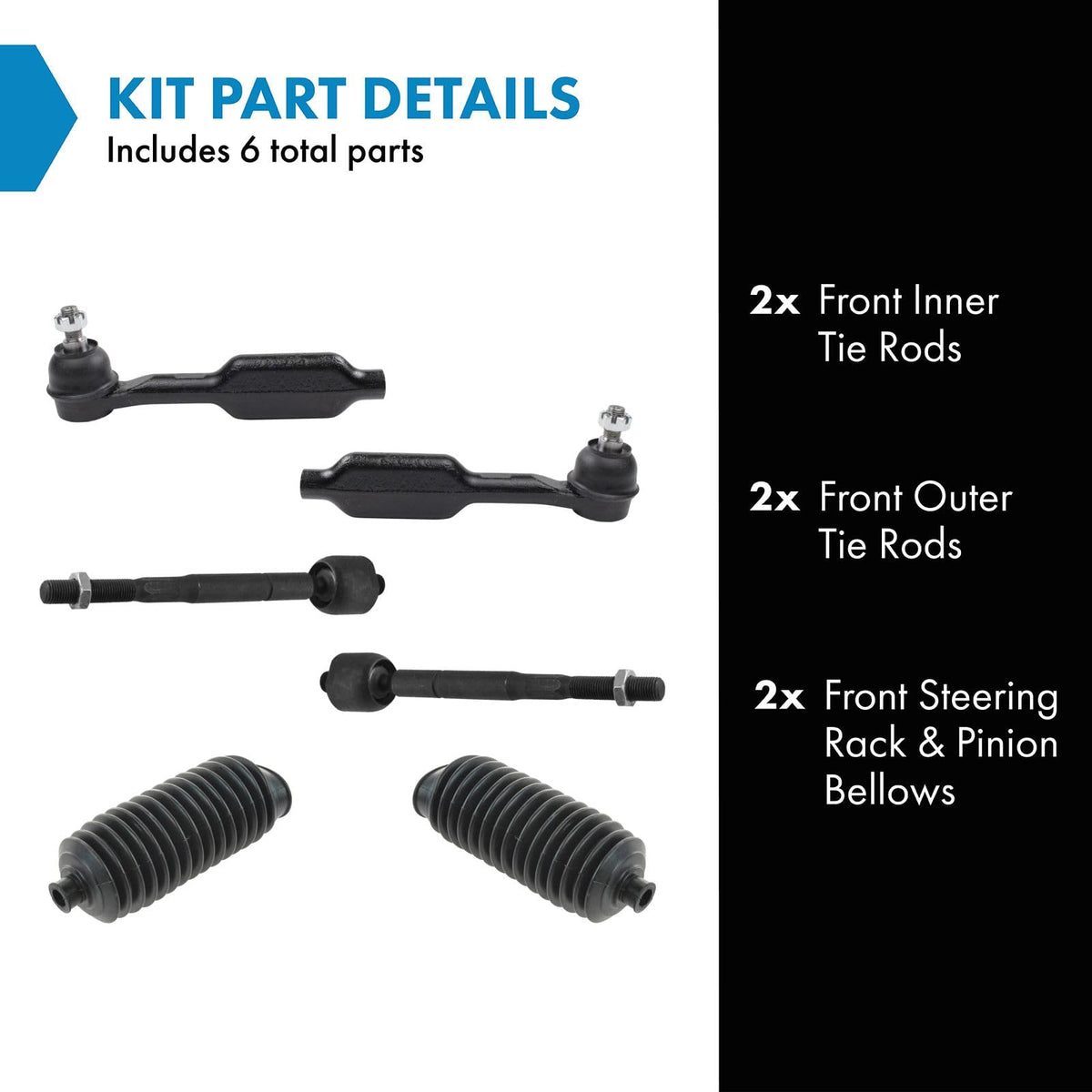 6 Piece Steering KitKit Includes(2) Front Inner Tie Rods(2) Front Outer Tie Rods(2) Front Steering Rack & Pinion BellowsFitmentCompatible with: 2005-09 Honda Odyssey Touring V6 3.5L FrontProduct AttributesQuantity: 6 PieceProduct Features Application Specific Design: No modifications necessary Anti-Corrosion Coated: Enhanced surface life Pre-greased: No additional maintenance required Kitted for Restored Performance: Improved road-feel and handlingItem DetailsTRQ suspension kits are manufactured using premium raw materials and coatings for extended service life. Each TRQ suspension component is designed to be a direct, maintenance-free replacement to the stock unit. To extend the life of your steering and suspension components, TRQ recommends replacing components in pairs, sets, or kits. All products are fit and road-tested in our Massachusetts R&D facility to ensure we deliver on our promise of Trusted Reliable Quality.Reference NumbersACDelco: 45A1217Beck/Arnley: 101-5829, 103-3070CTR: CE0210, CEHO24Deeza: HN-T627Delphi: TA3115DIY Solutions: SUS07211, SUS07957Dorman - OE Solutions: 534-837Dorman - Premium: TO59325PREMPI: 88-1626-KETS - Archived: 35ES800225ETS: 35ES800225FVP: TO59325Honda: 53010SHJA02, 53540SHJA51IMC: 439-21039, 43921039534, 43921039592Import Direct Chassis: ER06021MAS Industries: TO59325MAS: TO59325Mcquay-Norris: ES4464Mevotech Original Grade: GS60605Mevotech: DGS60605, GS60605, MS60605, MS60705MOOG Chassis Products: ES800225, EV800226Nascar Advantage: ES800225OMNIPARTS: 29040346Pronto: TO59325QuickSteer: ES800225Rare Parts: 28738Raybestos Chassis: 401-2217, 401-2217BSKP: SES800225Suspensia: X17TE1673XRF: ES800225